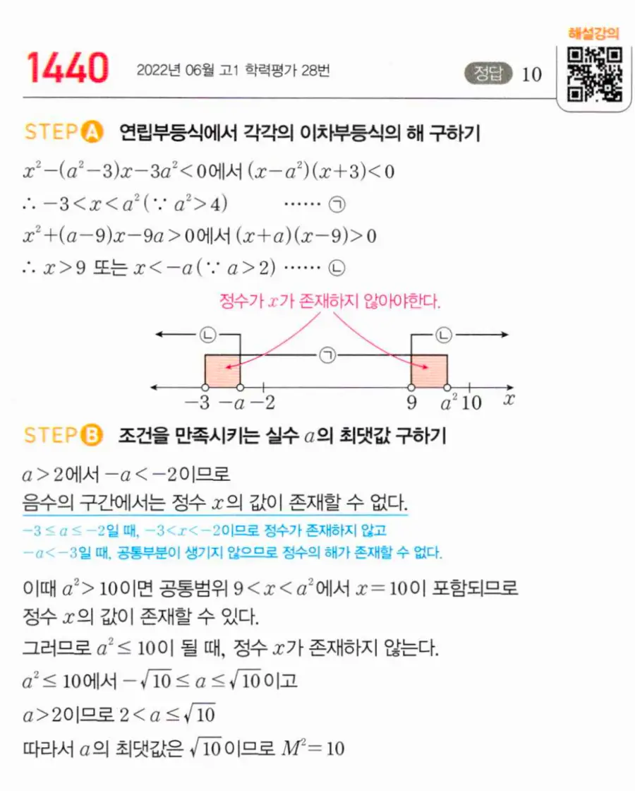 양수 구간 9 < x < a²에 정수 10이 안 들어가려면 a² ≤ 10. 열린 부등호이므로 a² = 10일 때 x = 10 미포함 → 등호 성립.