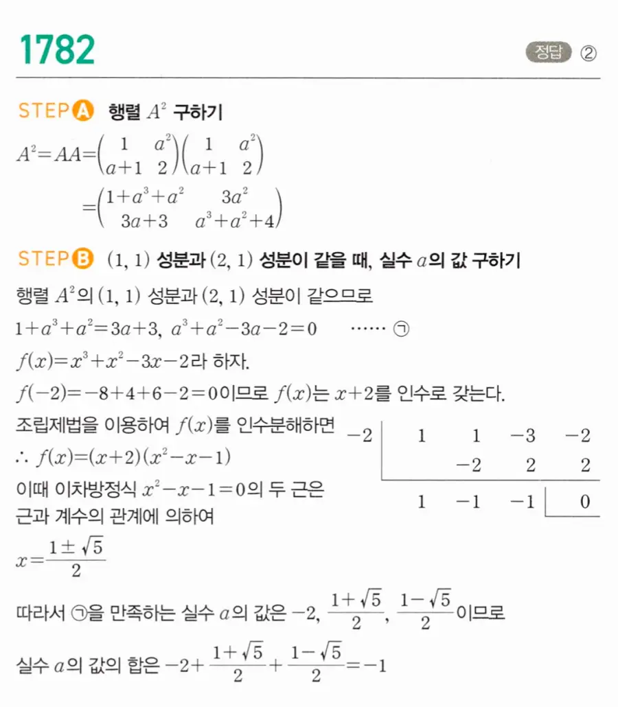 STEP B X²+Y²=(A−2E)²+(3E−A)²=2A²−10A+13E. 케일리-해밀턴 정리로 A²−5A+6E=O이므로, 2(A²−5A+6E)+E=E