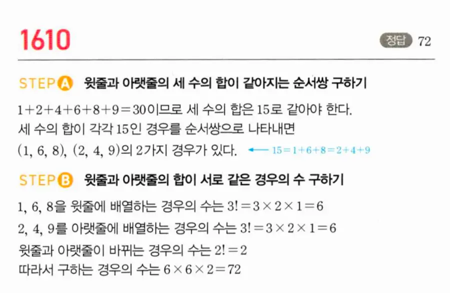 이 문제의 핵심은 제약이 강한 조건부터 먼저 처리하는 것입니다. 2학년 2명은 반드시 사각 의자 b₁, b₂, b₃ 중 2개에 앉아야 하므로, ① 먼저 2학년 2명이 앉을 사각 의자 2개를 선택하고 배열합니다. ② 나머지 사각 의자 1개와 둥근 의자 3개, 총 4자리에 1학년 2명과 3학년 2명을 배치합니다. 이때 2학년의 위치(b₁b₂, b₁b₃, b₂b₃)에 따라 나머지 배치가 달라지므로 경우를 나누어 합의 법칙으로 계산합니다.