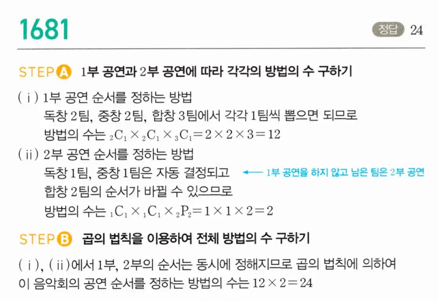 마플시너지 공통수학1 12단원 1682번 – 이틀 동안 5팀의 공연 날짜와 순서 정하기