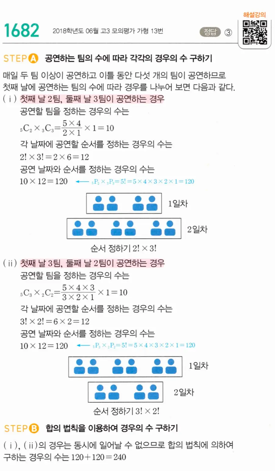 이 문제는 “어느 창문에 어떤 시트지를”이라는 배정 문제이지만, 시트지의 모양이 두 종류(정사각형·삼각형)이고 삼각형은 창문을 나누는 방향까지 고려해야 합니다. 핵심은 과정을 세 단계로 분리하는 것입니다. ① 정사각형 시트지가 갈 창문 선택(조합), ② 남은 창문의 분할 방향 결정(곱), ③ 삼각형 시트지 색 배열(순열). 각 단계가 독립적이므로 곱의 법칙을 적용합니다.