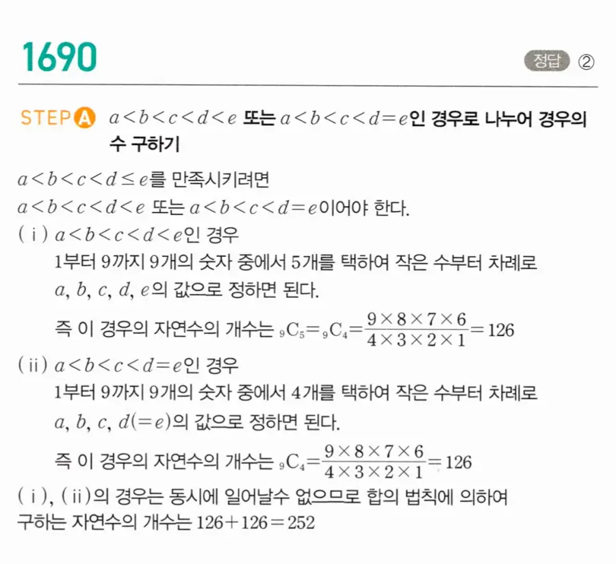 • a<b<c<d이므로 1~9에서 4개를 택하면 자동으로 네 자리 수가 하나 결정된다.