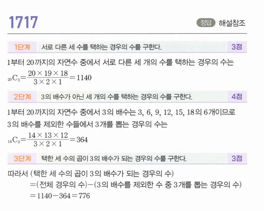 - 1단계: 14명에서 3명을 선출하는 전체 방법의 수 ₁₄C₃ = 364.