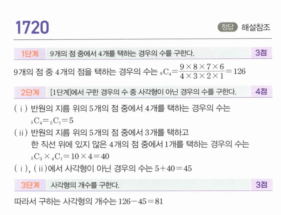 • 1단계: 직사각형의 개수. 가로선 4개 중 2개 택하기 ₄C₂ = 6, 세로선 6개 중 2개 택하기 ₆C₂ = 15 → 6 × 15 = 90.