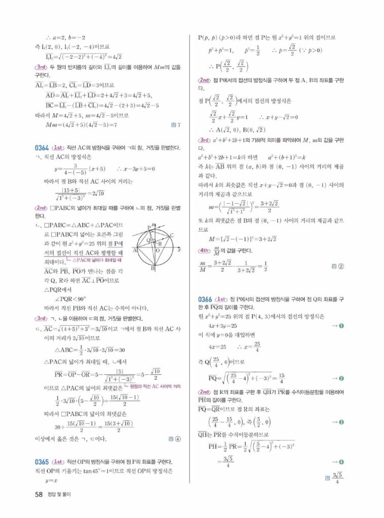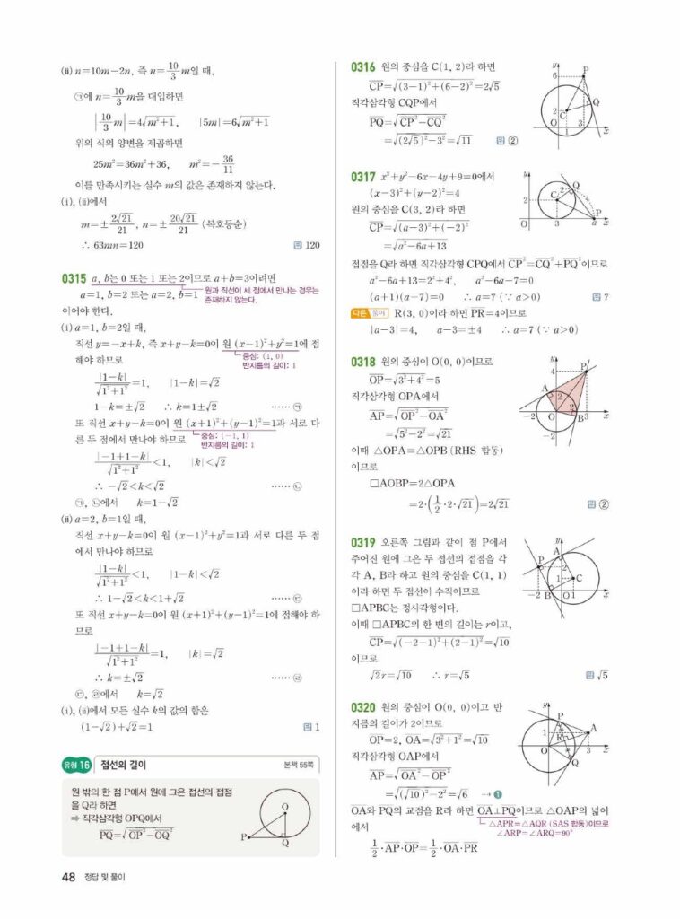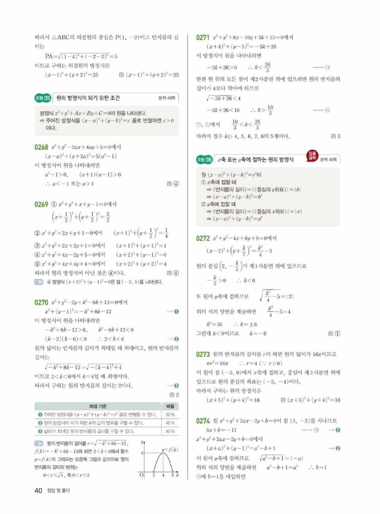 원의 방정식은 ‘도형의 방정식’ 단원의 꽃이라고 불릴 만큼 중요하고, 문제 유형도 다양합니다. 특히 02단원에서 배운 직선과의 위치 관계, 접선의 방정식 등은 시험에 자주 출제되는 핵심 파트입니다. 답지를 활용하여 본인의 풀이와 꼼꼼히 비교해 보세요.