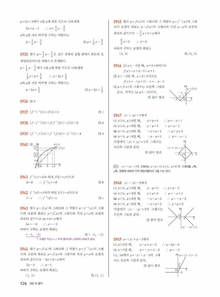 함수는 수학 전반에 걸쳐 사용되는 가장 중요한 개념입니다. 이번 단원에서는 함수의 기본적인 뜻(일대일 대응 등)부터 시작하여, 두 함수를 결합하는 합성함수, 그리고 그 반대 과정인 역함수까지 배웁니다. 개념을 정확히 이해하지 않으면 뒤따라오는 유리함수, 무리함수 단원에서 큰 어려움을 겪을 수 있으니, 답지를 통해 꼼꼼하게 복습하시기 바랍니다.