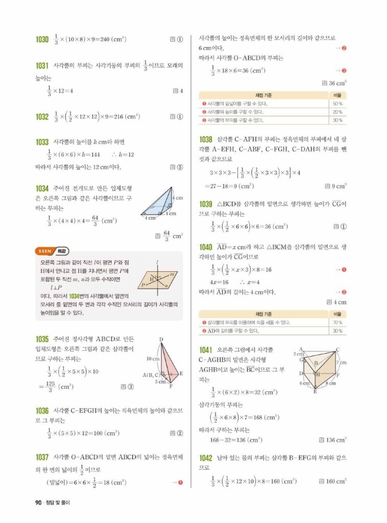 쎈 수학 중1-2 (09. 입체도형의 겉넓이와 부피) 답지 이미지