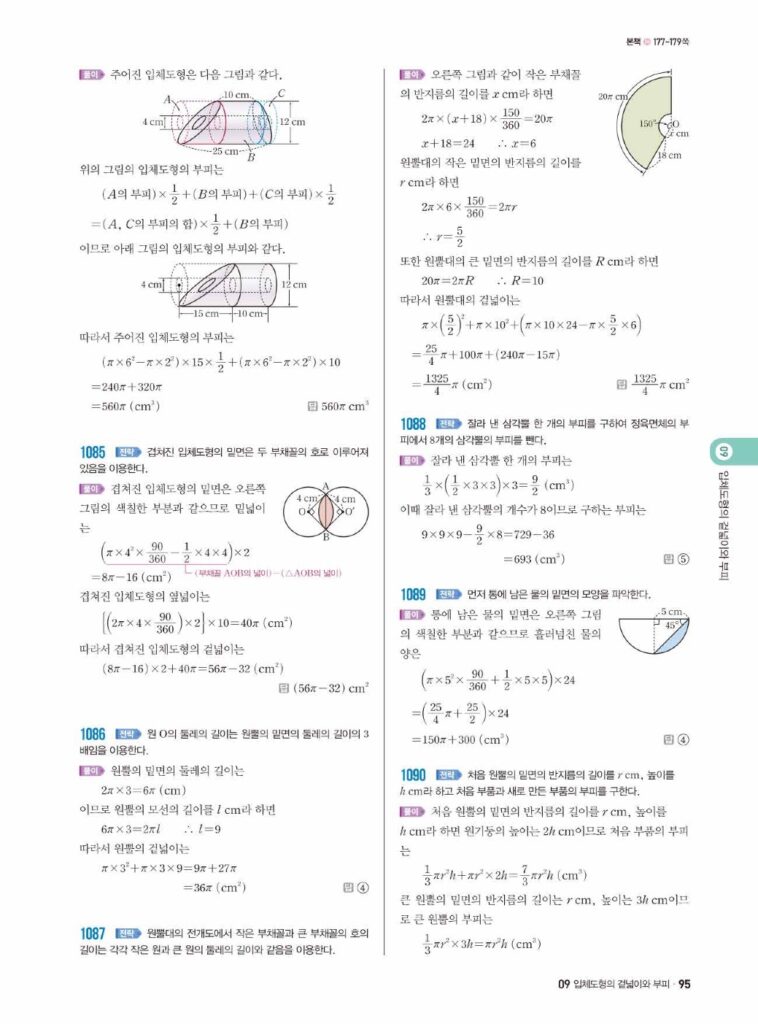 안녕하세요! **쎈 수학**으로 중학교 1학년 2학기 과정을 공부하는 학생, 학부모 여러분. ’08 회전체’에 이어, ‘IV. 입체도형’ 대단원의 마지막인 **’09. 입체도형의 겉넓이와 부피’** 정답 및 해설 자료(답지)를 공유합니다.