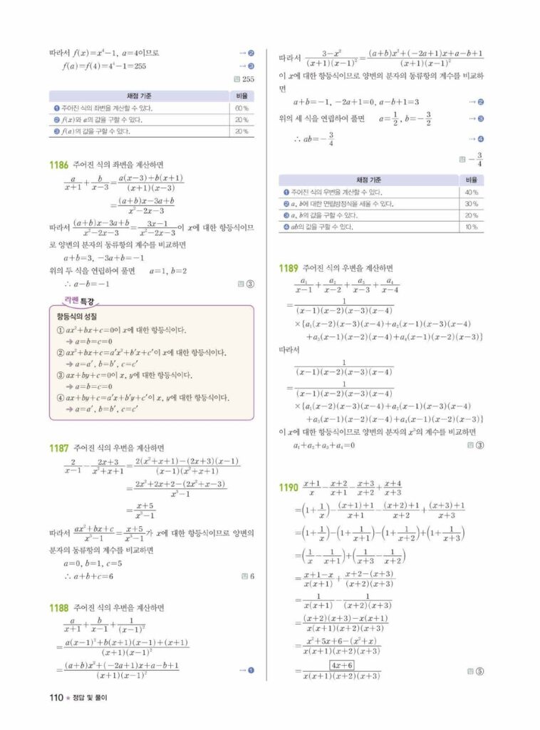 유리식은 ‘분수식’의 계산입니다. 덧셈/뺄셈은 ‘통분’, 곱셈/나눗셈은 ‘약분’이 기본이지만, 라이트쎈에서 가장 중요하게 다루는 계산 스킬은 ‘부분분수 분해’입니다.