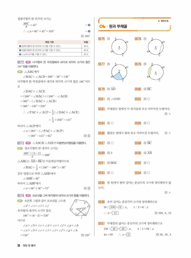 라이트쎈 B단계에서 가장 많이 틀리는 문제입니다. ‘중심각’의 크기에 따라 ‘정비례’하는 것과 ‘아닌 것’을 구분해야 합니다.