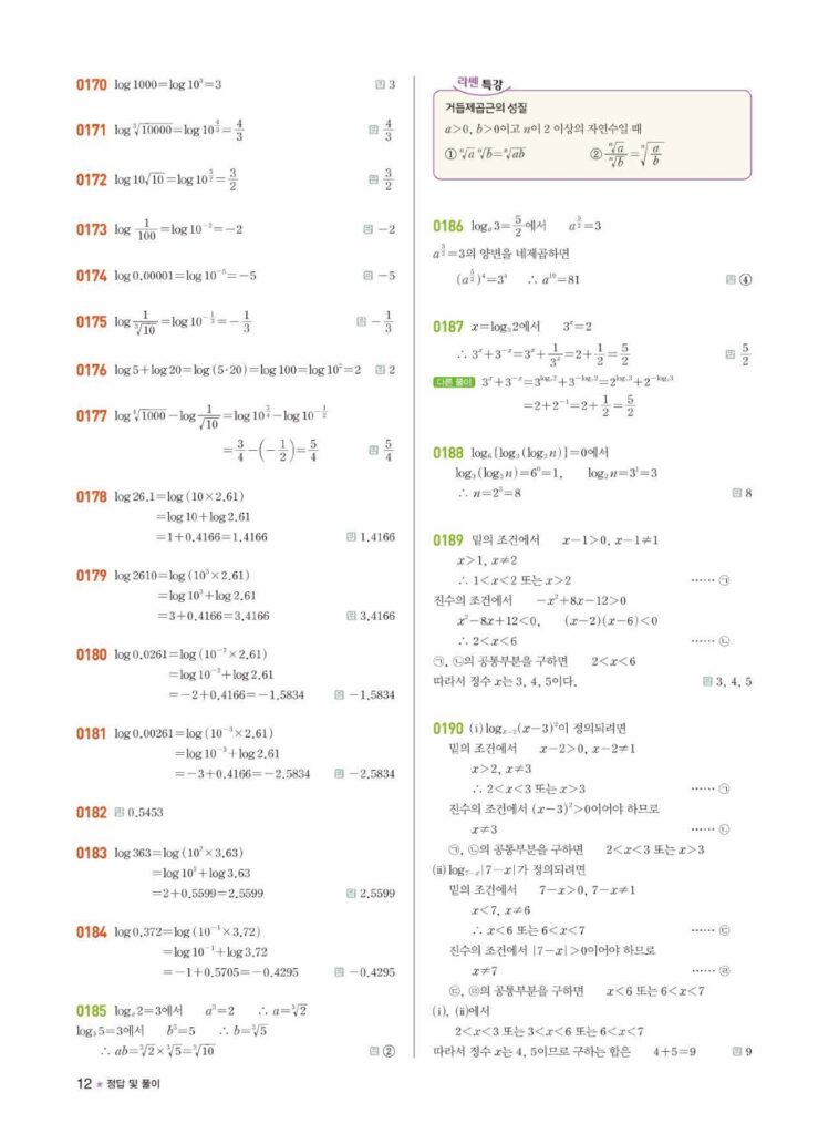 안녕하세요. 라이트쎈 대수(Algebra) 02단원 로그 정답 및 해설입니다.