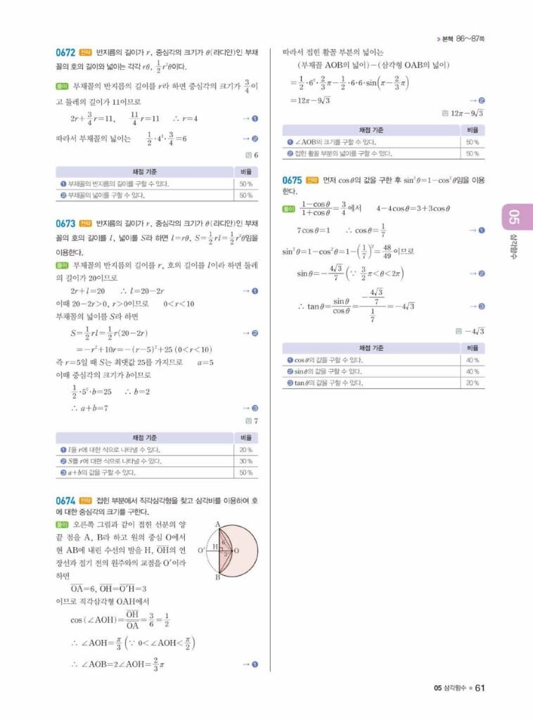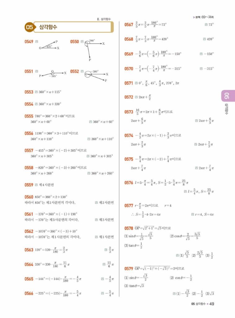 이 단원에서는 각도를 실수로 나타내는 호도법(Radian)을 배웁니다. 또한 좌표평면 위에서 동경의 위치에 따라 $\sin, \cos, \tan$의 부호가 어떻게 결정되는지(얼싸안코)를 확실히 익혀야 합니다.