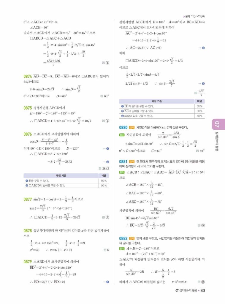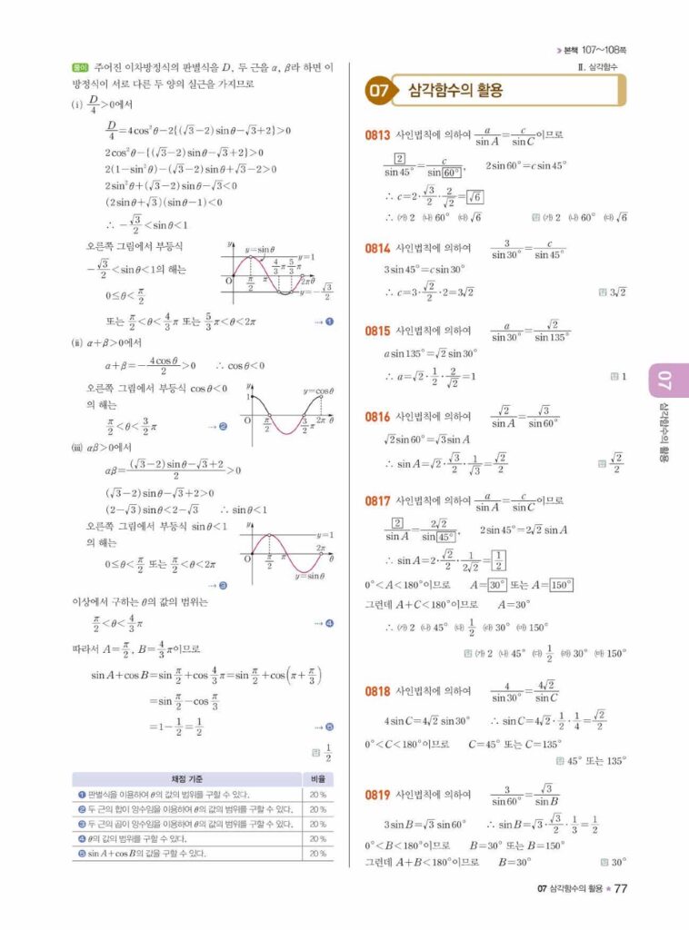 안녕하세요. 라이트쎈 대수(Algebra) 07단원 삼각함수의 활용 정답 및 해설입니다.