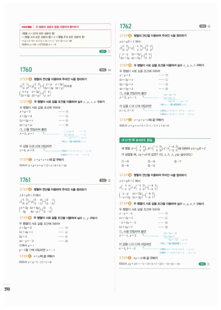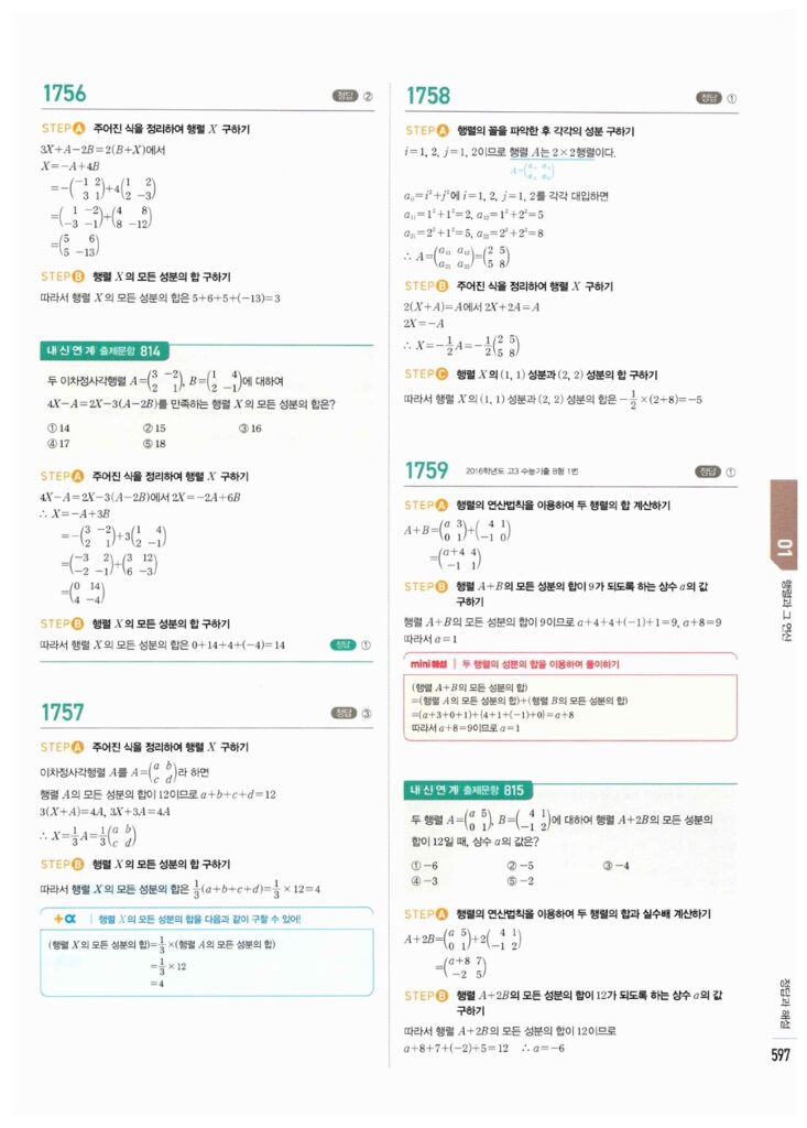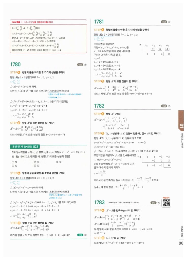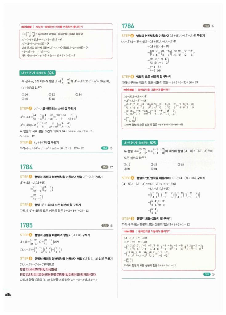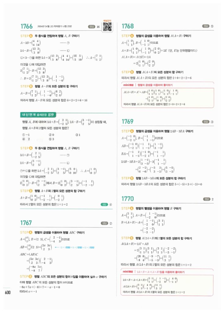 안녕하세요. **마플시너지 공통수학1** **4-1 행렬과 그 연산** 첫 번째 파트(1/2) 정답 및 해설입니다.