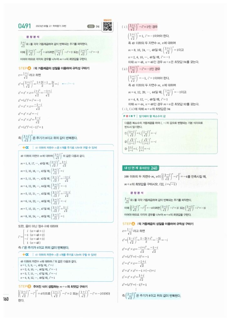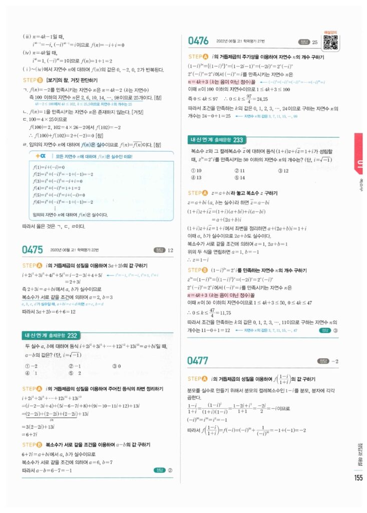 복소수는 실수부와 허수부를 정확히 구분해야 하며, **$i$의 거듭제곱($i, -1, -i, 1$)이 4개를 주기로 반복**된다는 성질을 이용한 계산 문제가 출제됩니다.