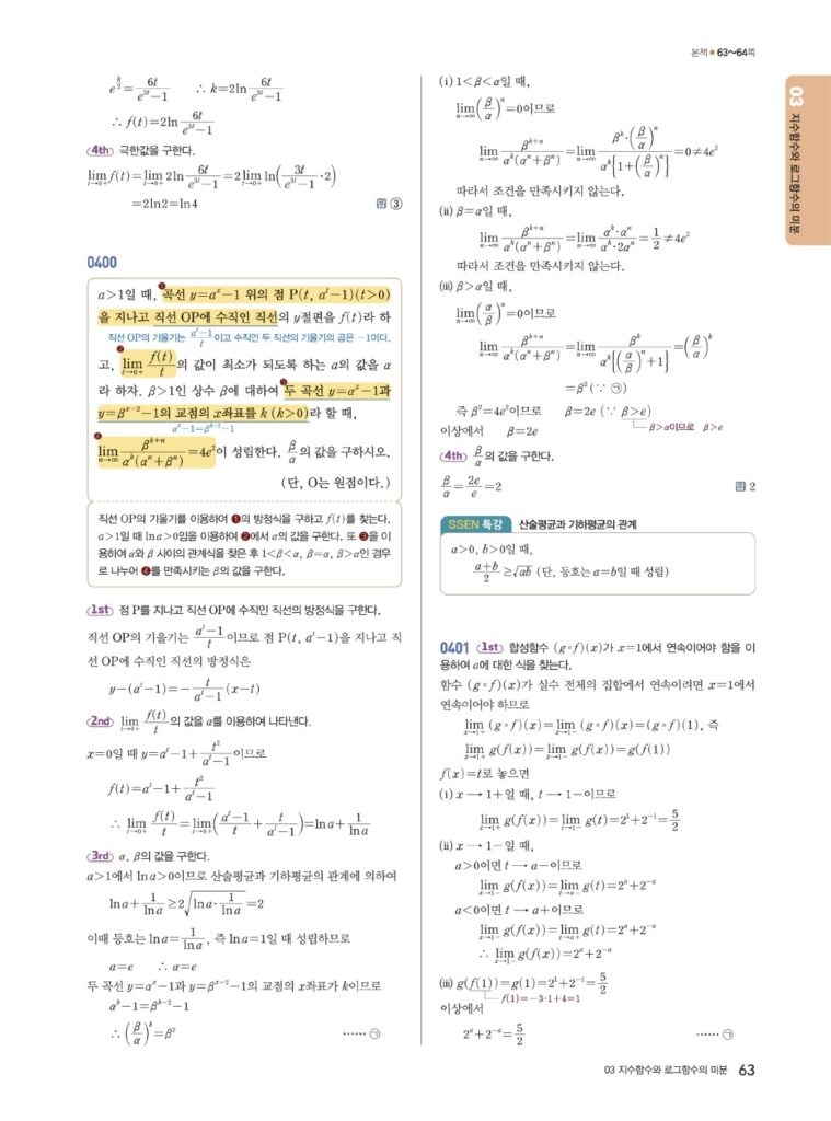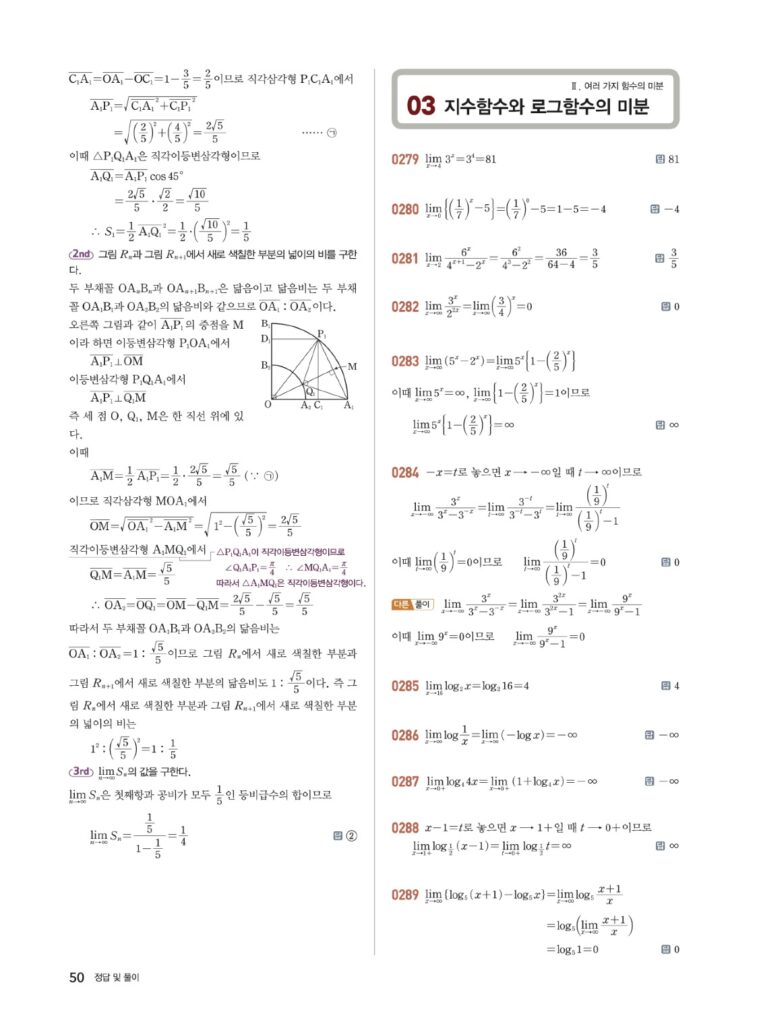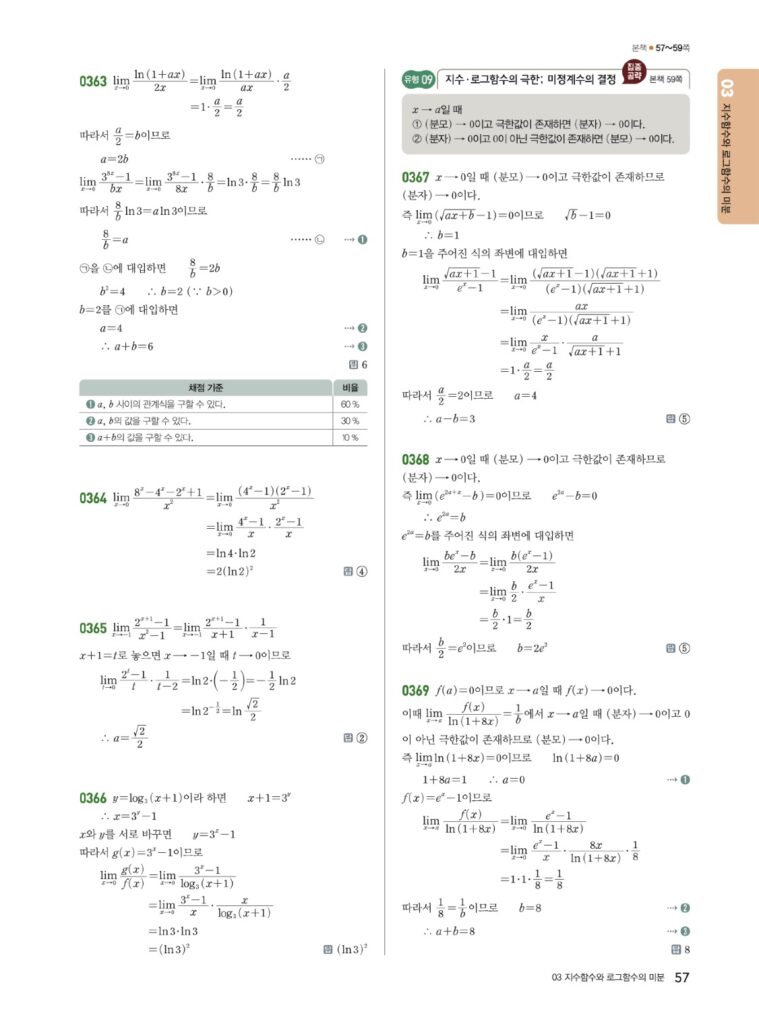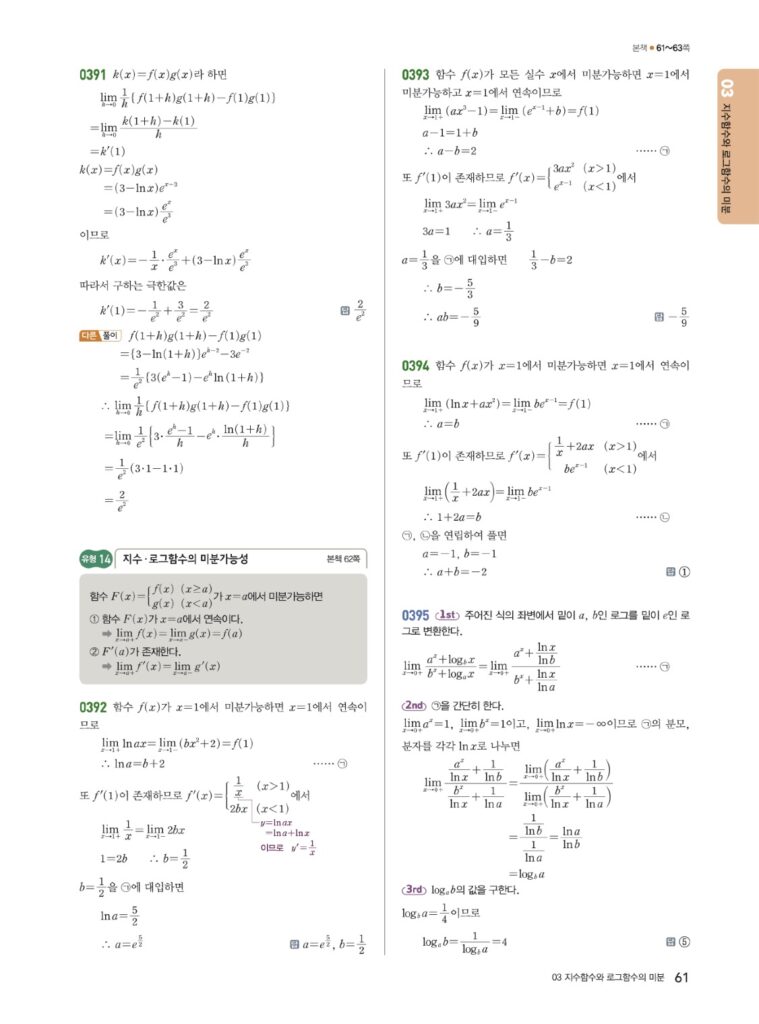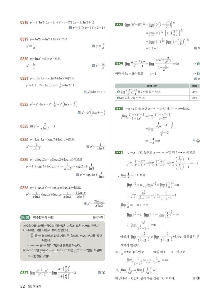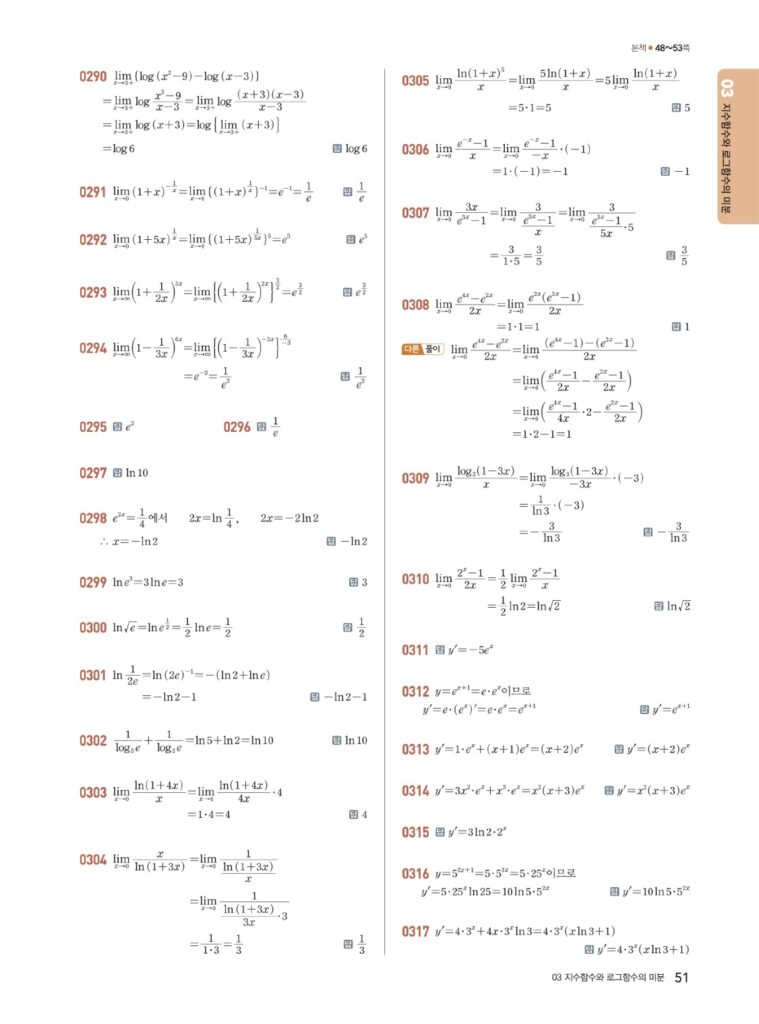 안녕하세요. **쎈 미적분2** **03단원 지수함수와 로그함수의 미분** 정답 및 해설입니다.