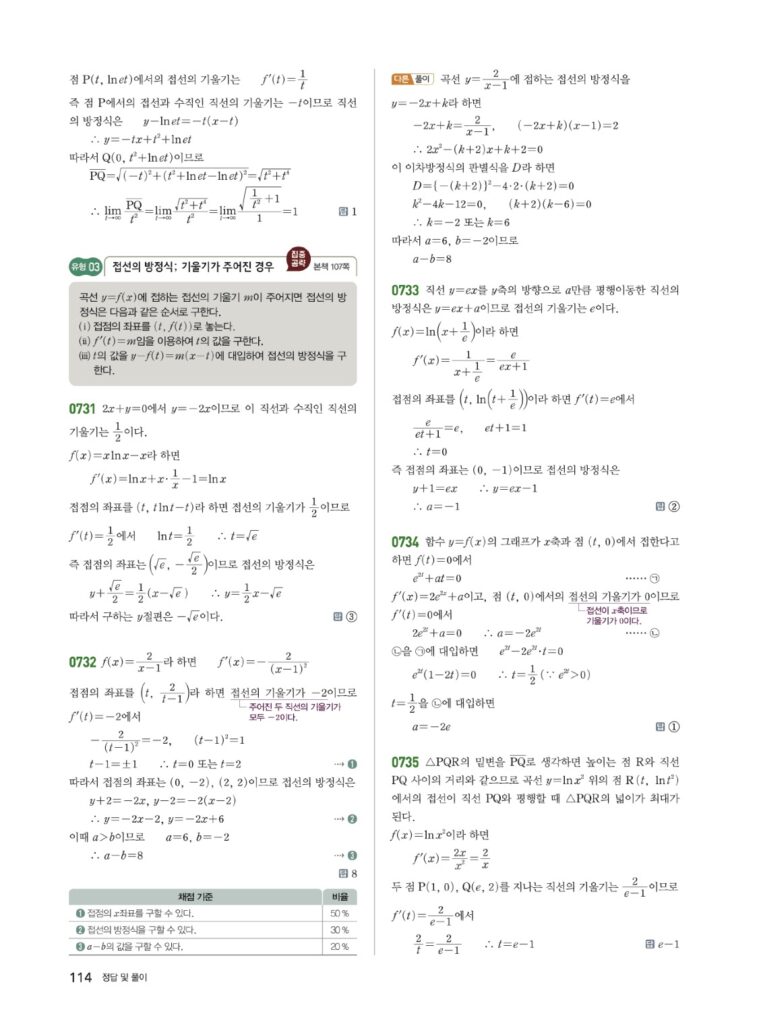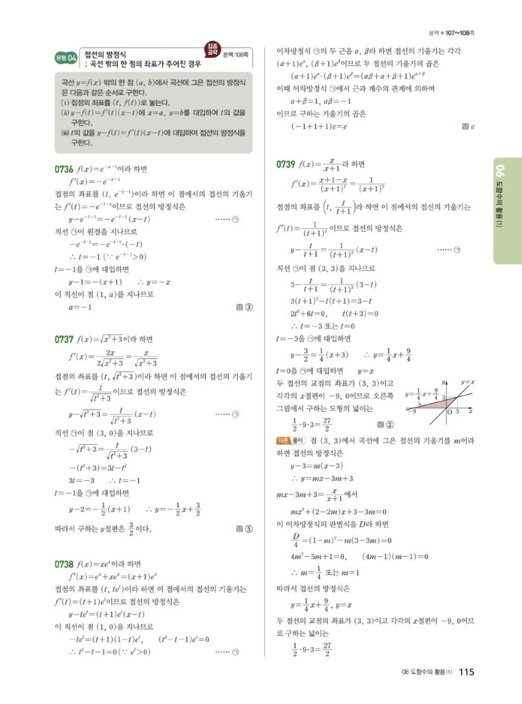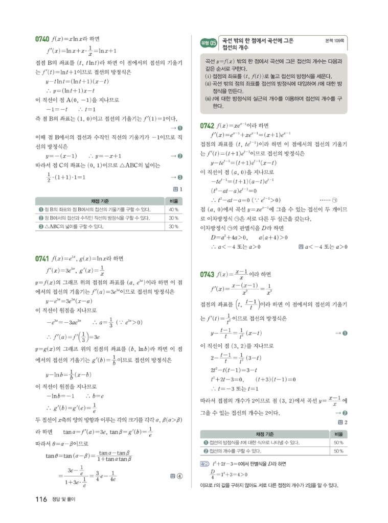 3. 곡선 밖의 점이 주어질 때: 접점 $(t, f(t))$를 미지수로 놓고 푼다.
