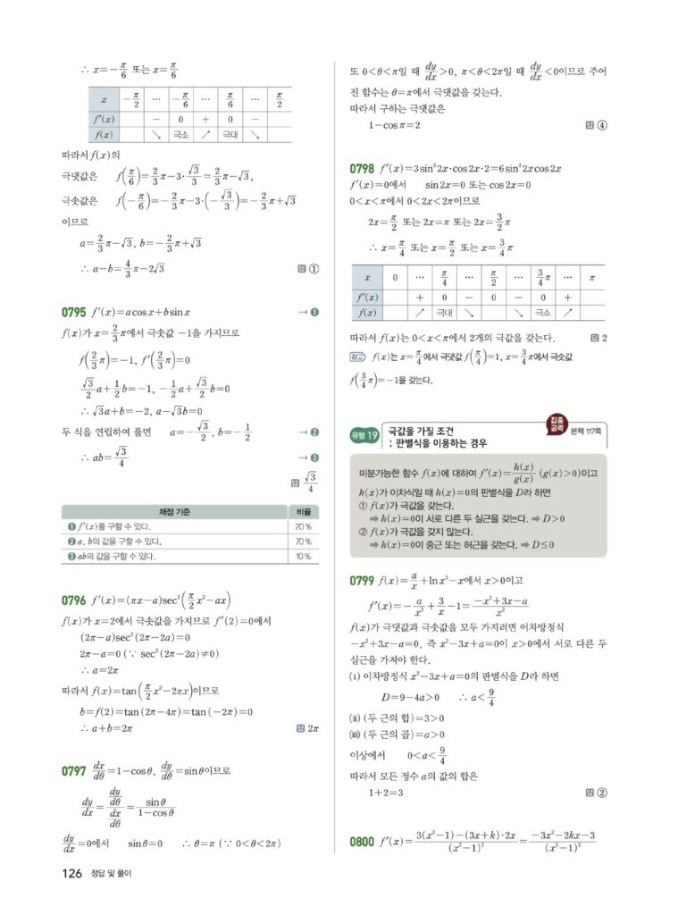 극값 판정은 **이계도함수($f”(x)$)**의 부호 변화를 이용하는 것이 빠를 수 있습니다. 복잡한 함수의 그래프를 추론하는 팁을 탑글 영상에서 확인하세요.