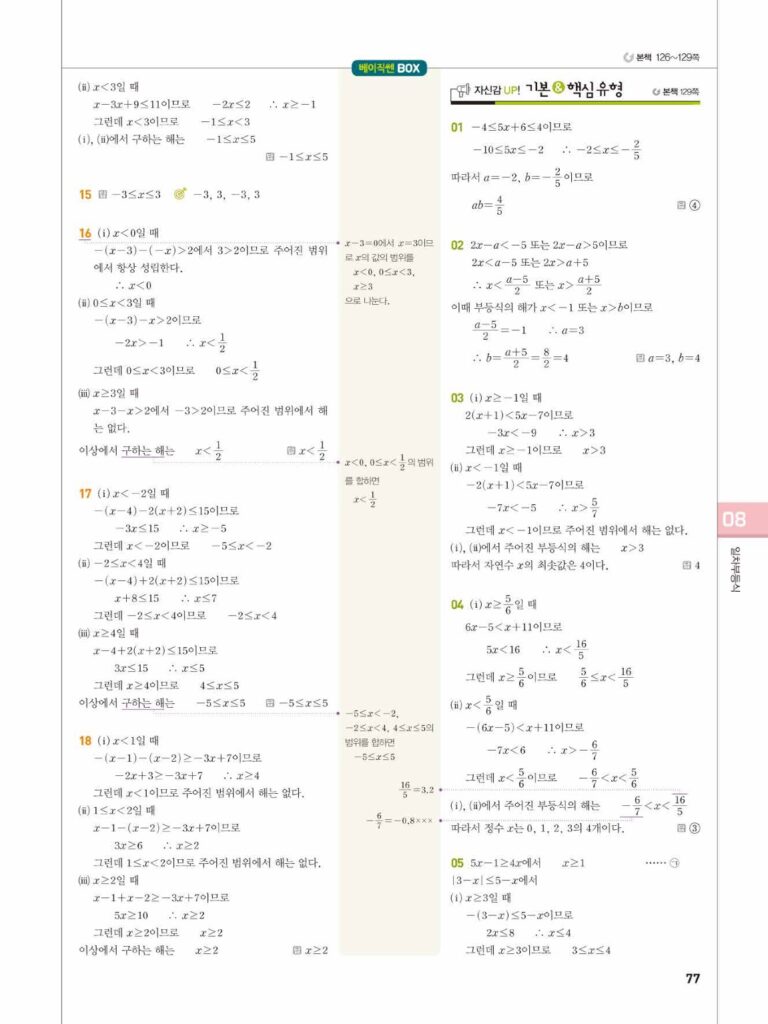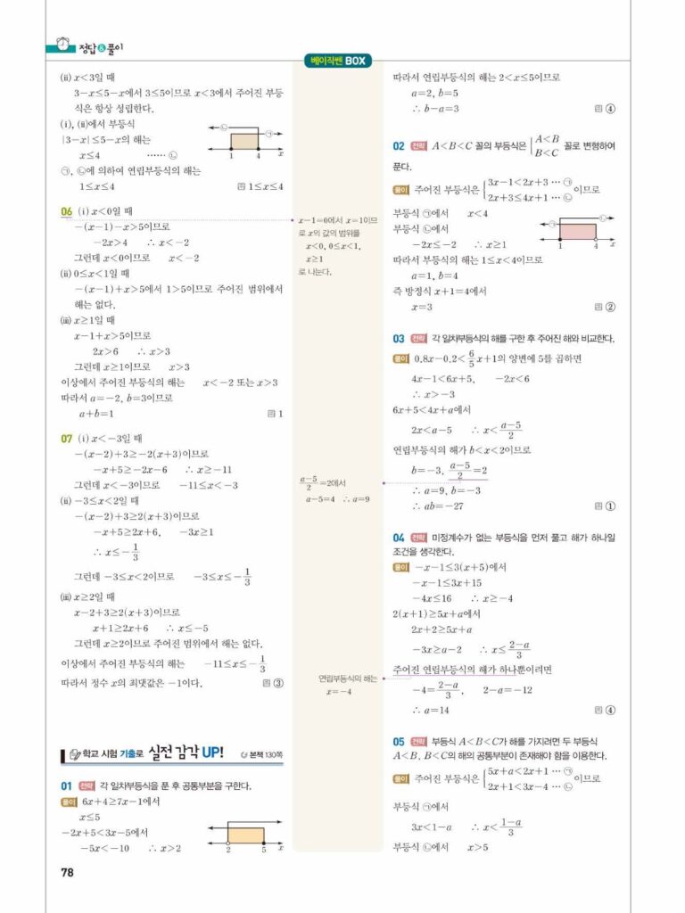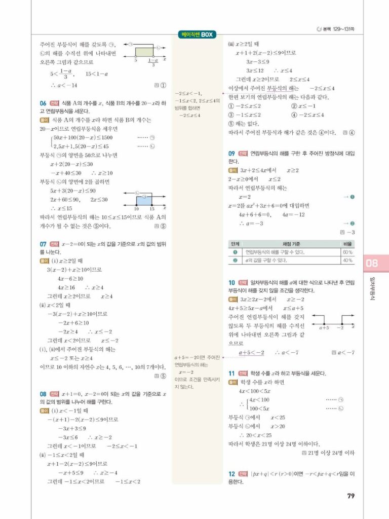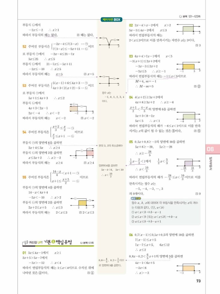 안녕하세요. **베이직쎈 공통수학1** **08단원 일차부등식** 정답 및 해설입니다.