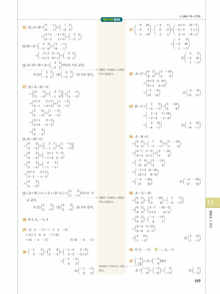 수고하셨습니다! **베이직쎈 공통수학1** **11단원 행렬과 그 연산** 정답 및 해설입니다.