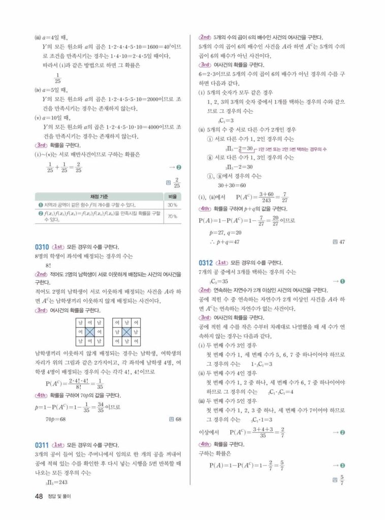 문제가 ‘적어도 하나’ 또는 ‘모두 ~가 아닌’ 조건을 포함할 경우, 여사건의 확률을 이용할지 고려해 보세요. 전체에서 반대되는 경우를 빼는 것이 빠릅니다.