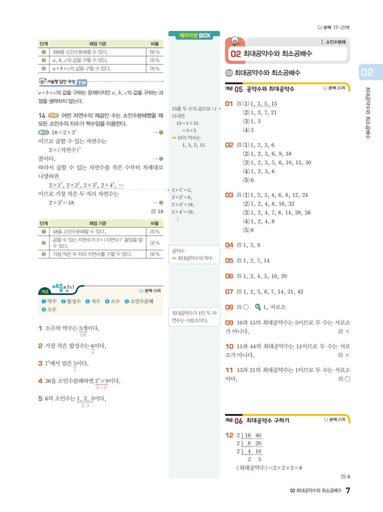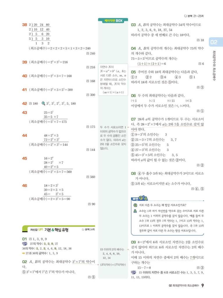안녕하세요. **베이직쎈 중1-1** **02단원 최대공약수와 최소공배수** 정답 및 해설입니다.