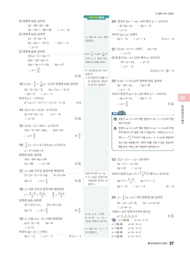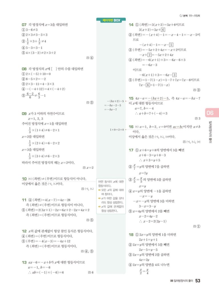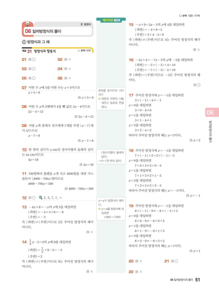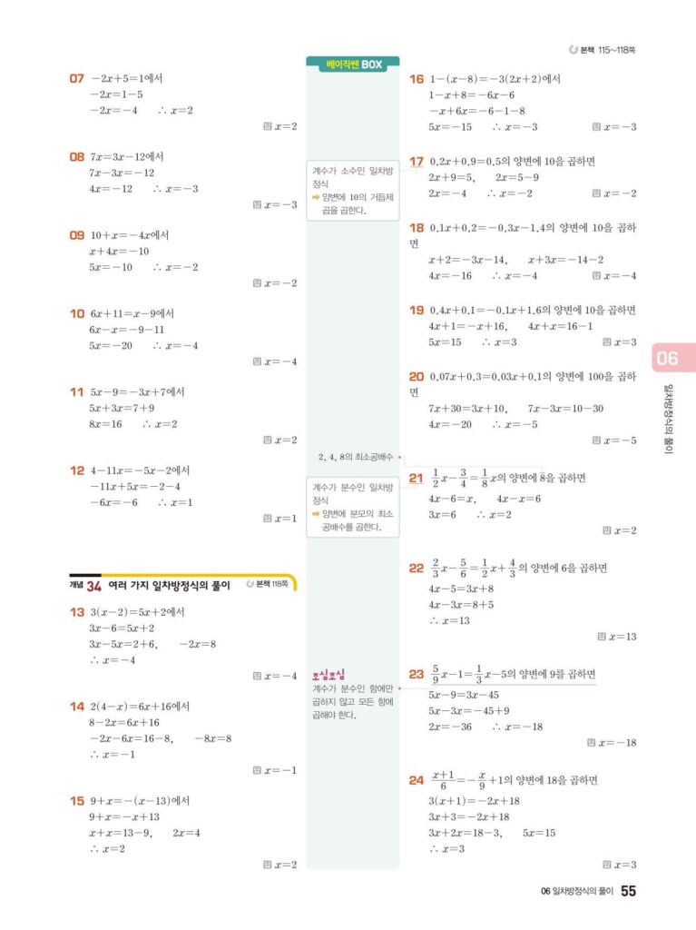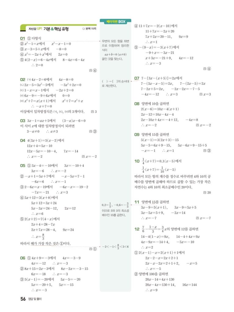 베이직쎈중1-1답지 06 일차방정식의 풀이