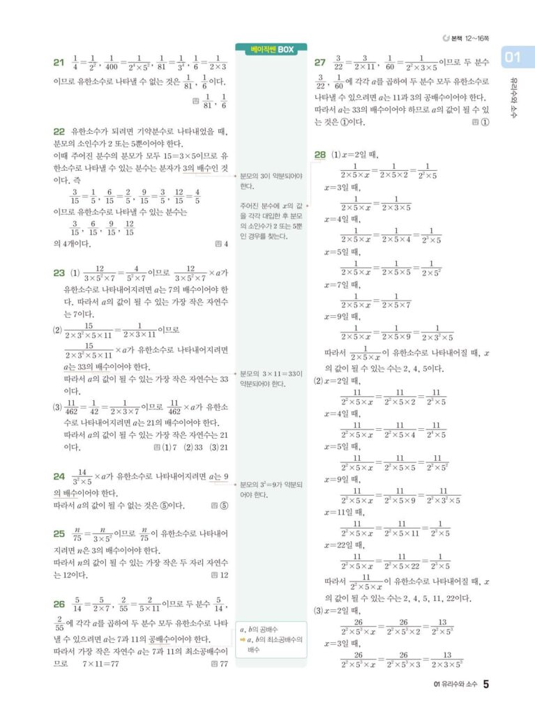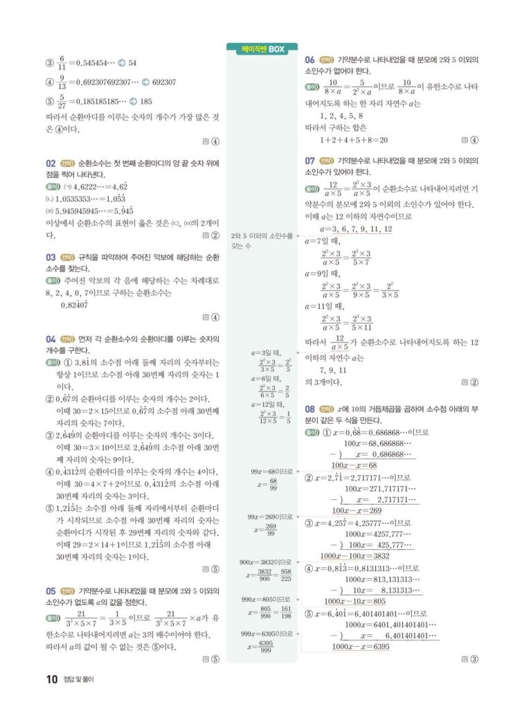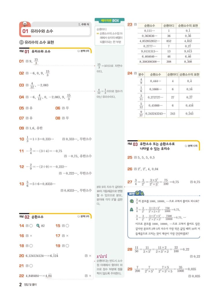 안녕하세요. **베이직쎈 중2-1** **01단원 유리수와 소수** 정답 및 해설입니다.