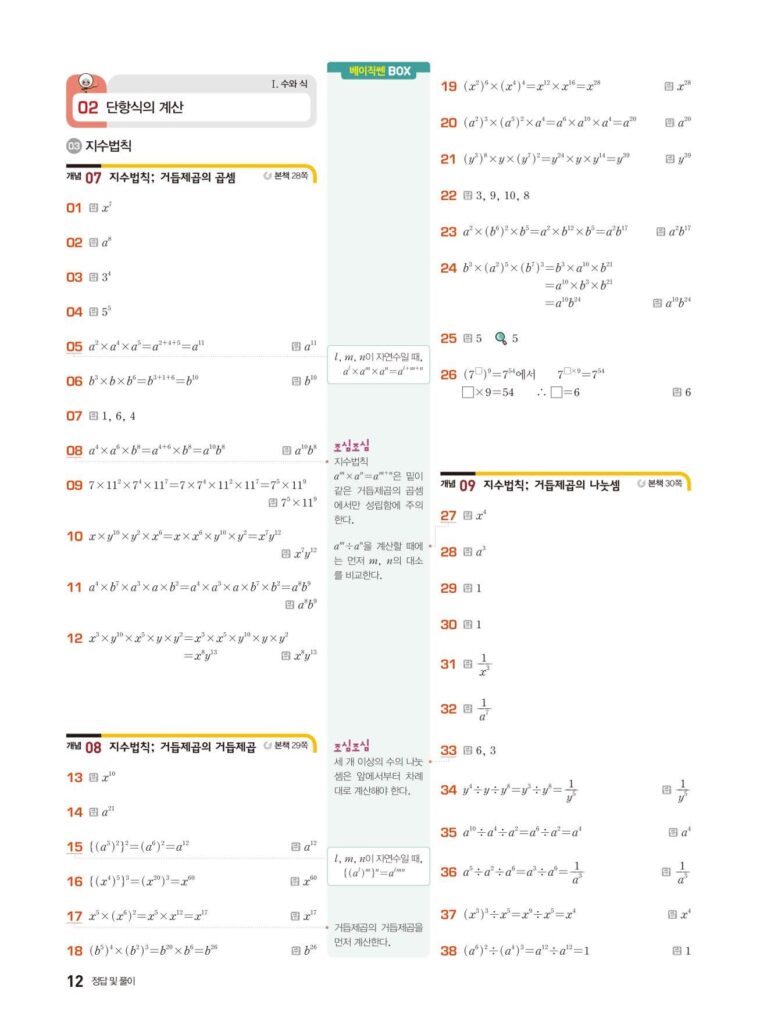 안녕하세요. **베이직쎈 중2-1** **02단원 단항식의 계산** 정답 및 해설입니다.