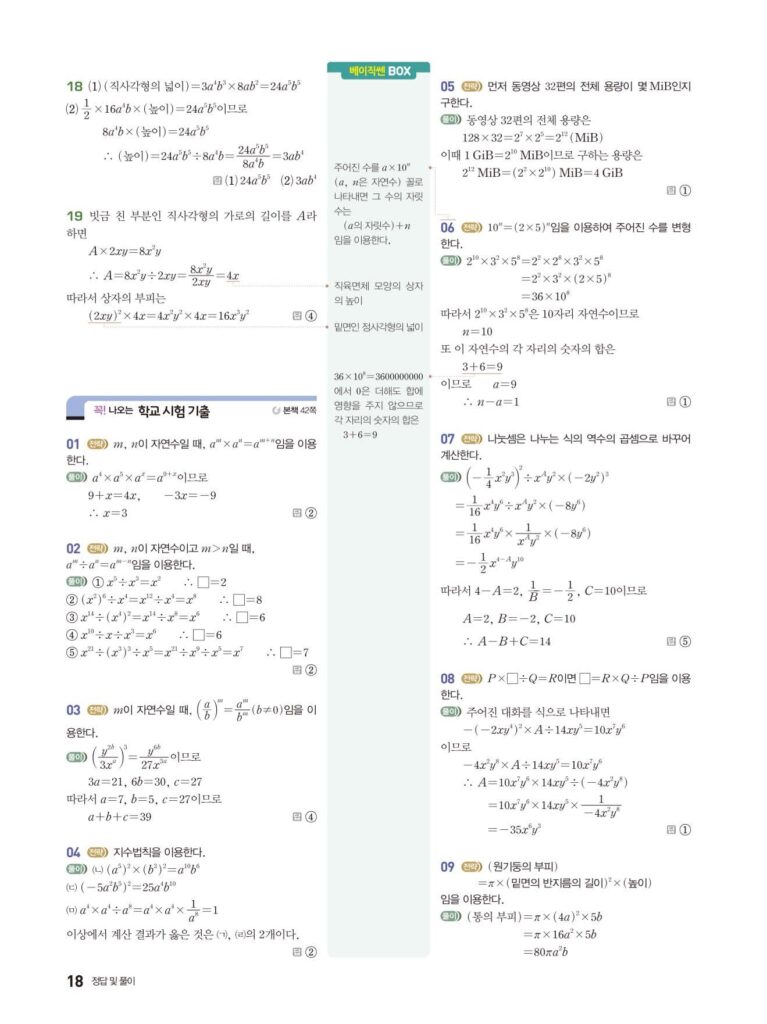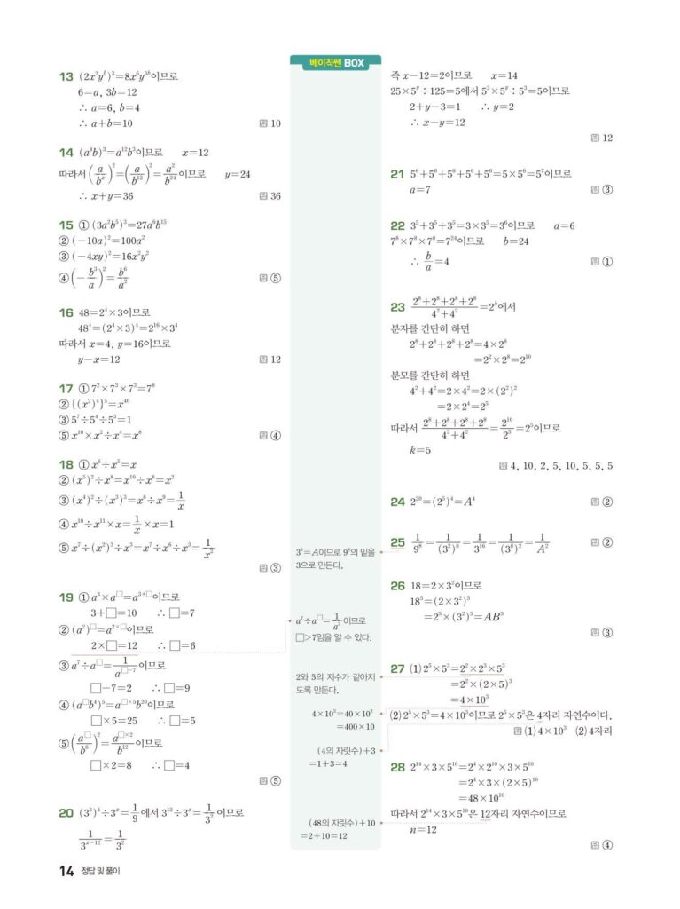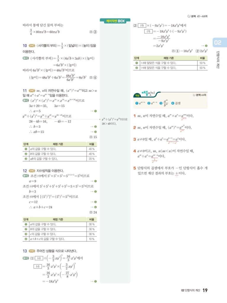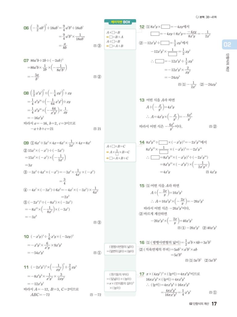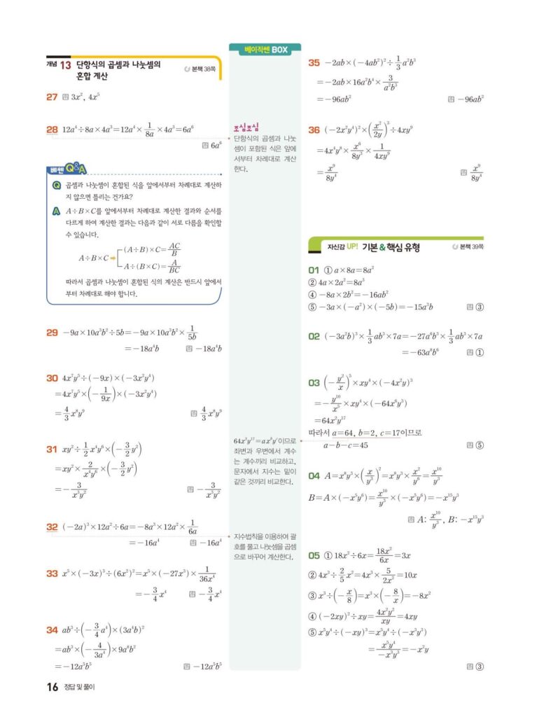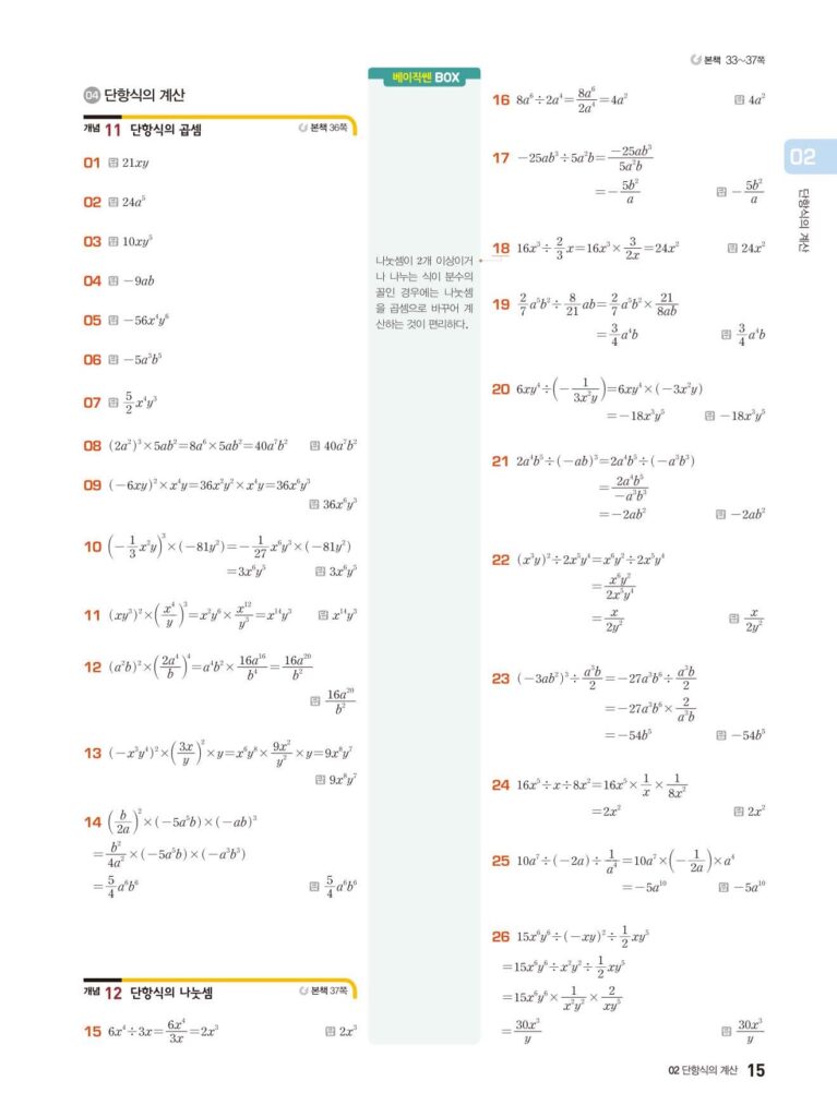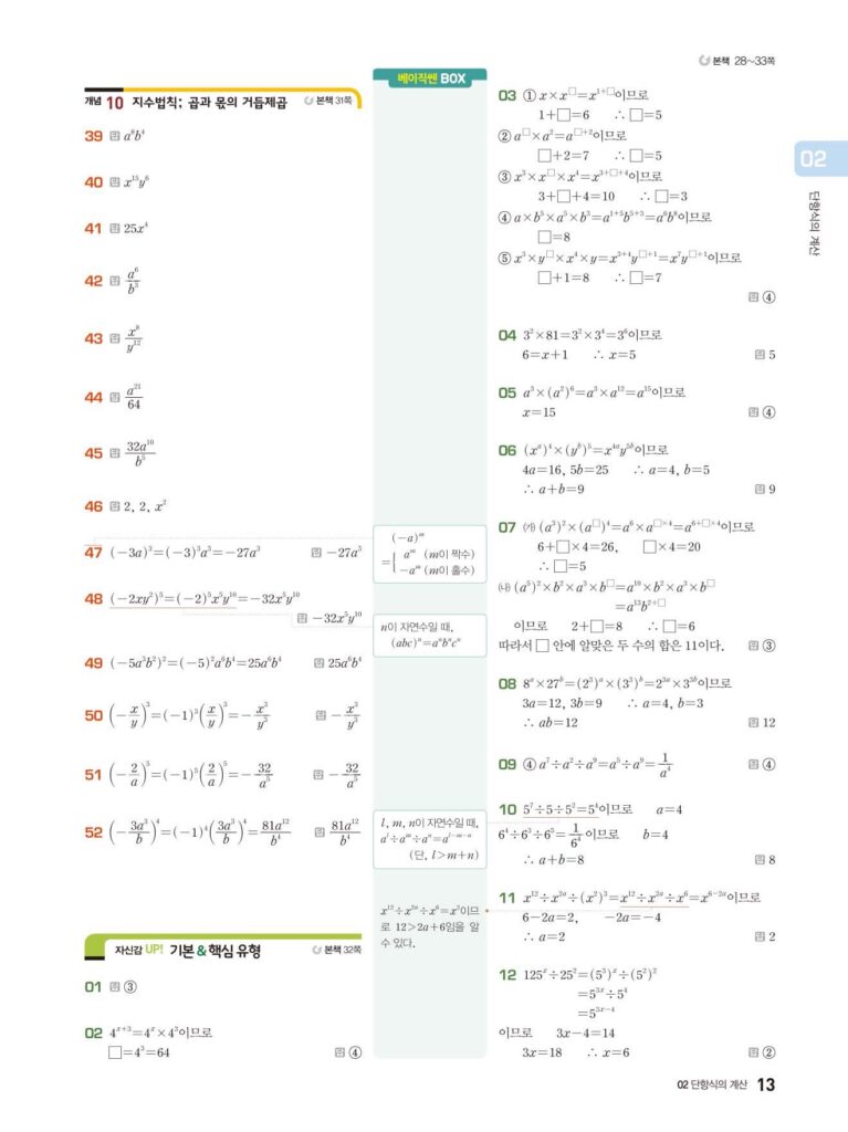 베이직쎈 중2-1 02. 단항식의 계산 답지