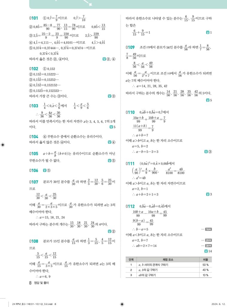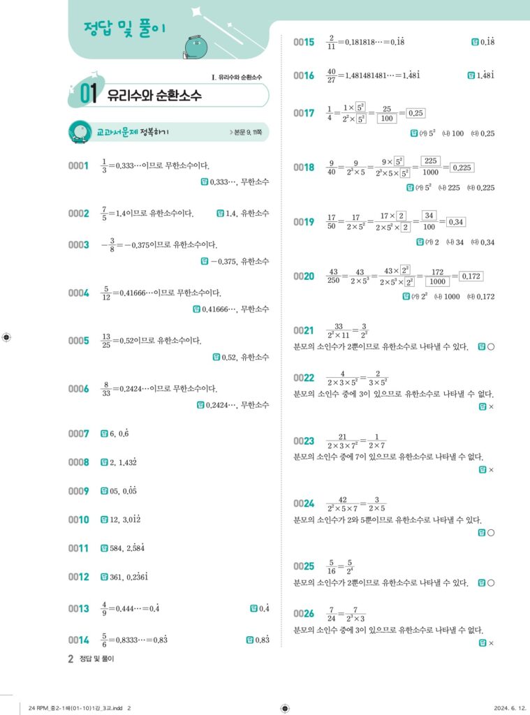 안녕하세요. **RPM 중2-1** **01단원 유리수와 순환소수** 정답 및 해설입니다.