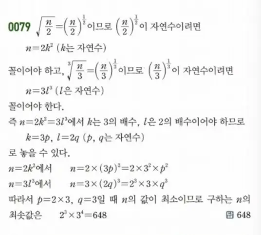 - 최솟값을 만족하는 지수는 \(a=3, b=4\)이므로 \(n = 2^3 \times 3^4 = 648\)입니다.