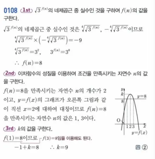안녕하세요, 여러분의 수학적 사고력을 키워주는 명쾌한 1타 강사입니다! 오늘은 지수의 거듭제곱근 성질과 이차함수의 그래프 특징이 결합된 **쎈대수 0108번** 문제를 다뤄보려고 합니다.