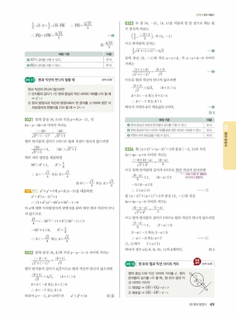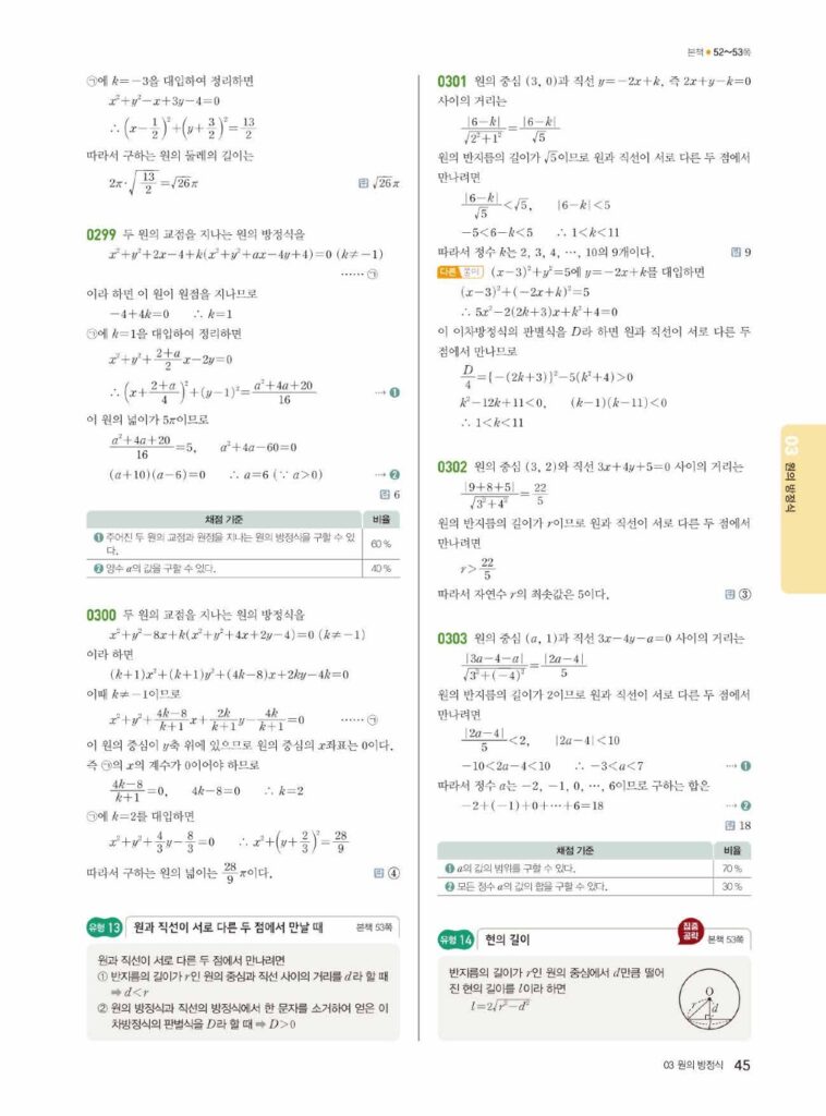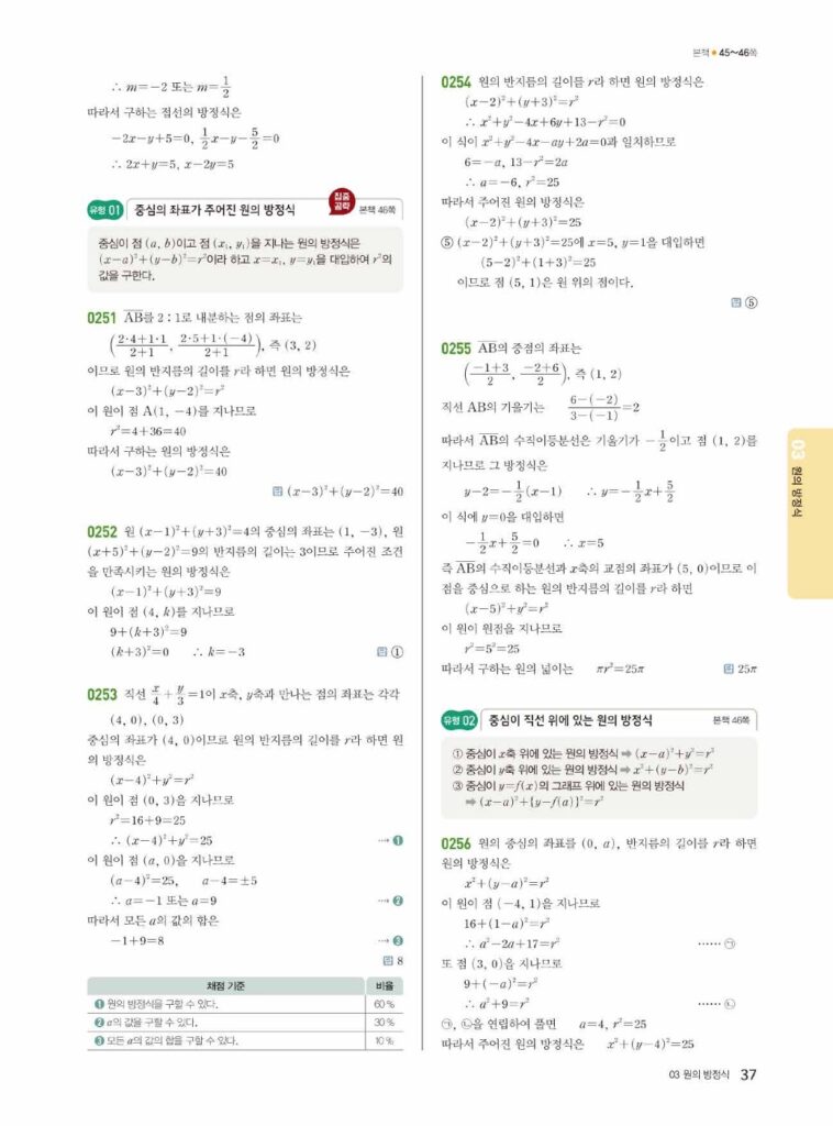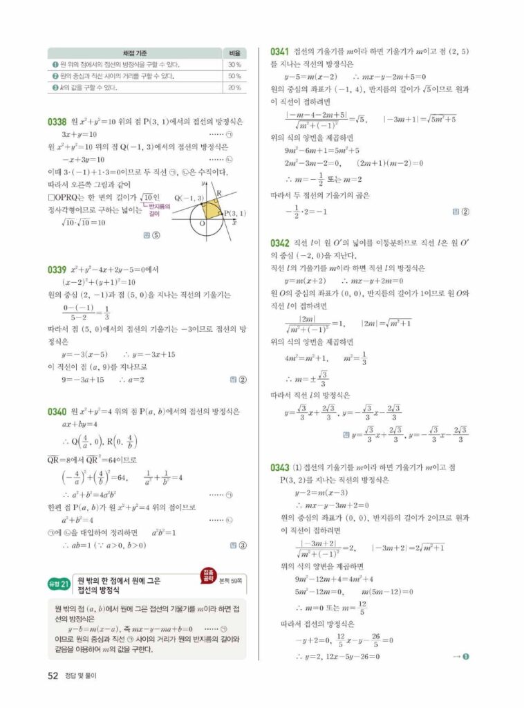 원의 방정식은 ‘도형의 방정식’ 단원의 꽃이라고 불릴 만큼 중요하고, 문제 유형도 다양합니다. 특히 02단원에서 배운 직선과의 위치 관계, 접선의 방정식 등은 시험에 자주 출제되는 핵심 파트입니다. 답지를 활용하여 본인의 풀이와 꼼꼼히 비교해 보세요.