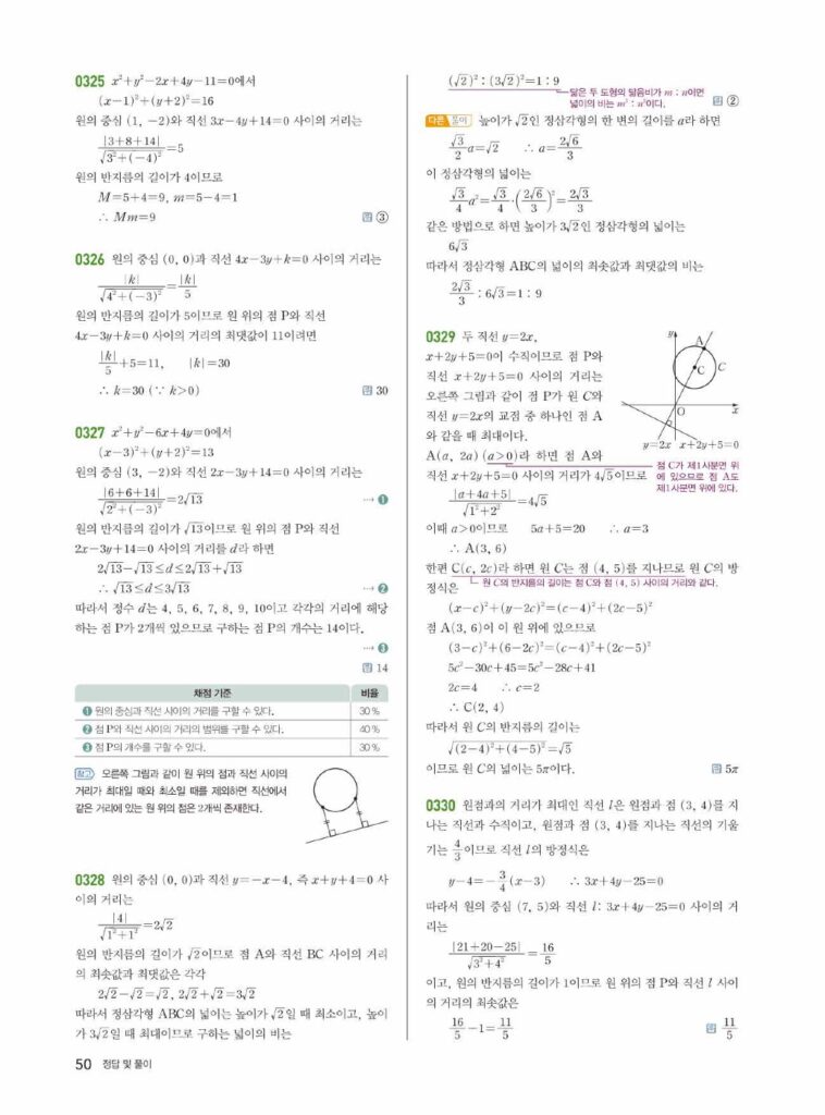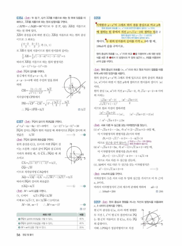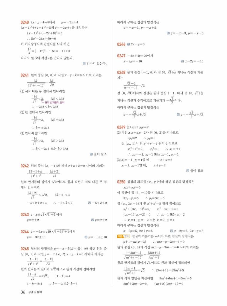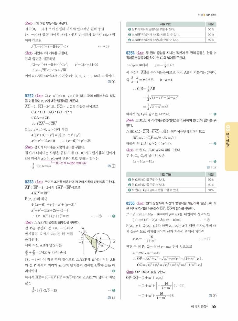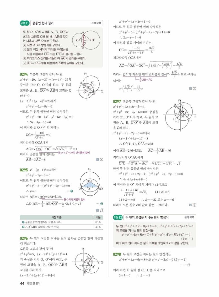 원의 방정식은 ‘도형의 방정식’ 단원의 꽃이라고 불릴 만큼 중요하고, 문제 유형도 다양합니다. 특히 02단원에서 배운 직선과의 위치 관계, 접선의 방정식 등은 시험에 자주 출제되는 핵심 파트입니다. 답지를 활용하여 본인의 풀이와 꼼꼼히 비교해 보세요.