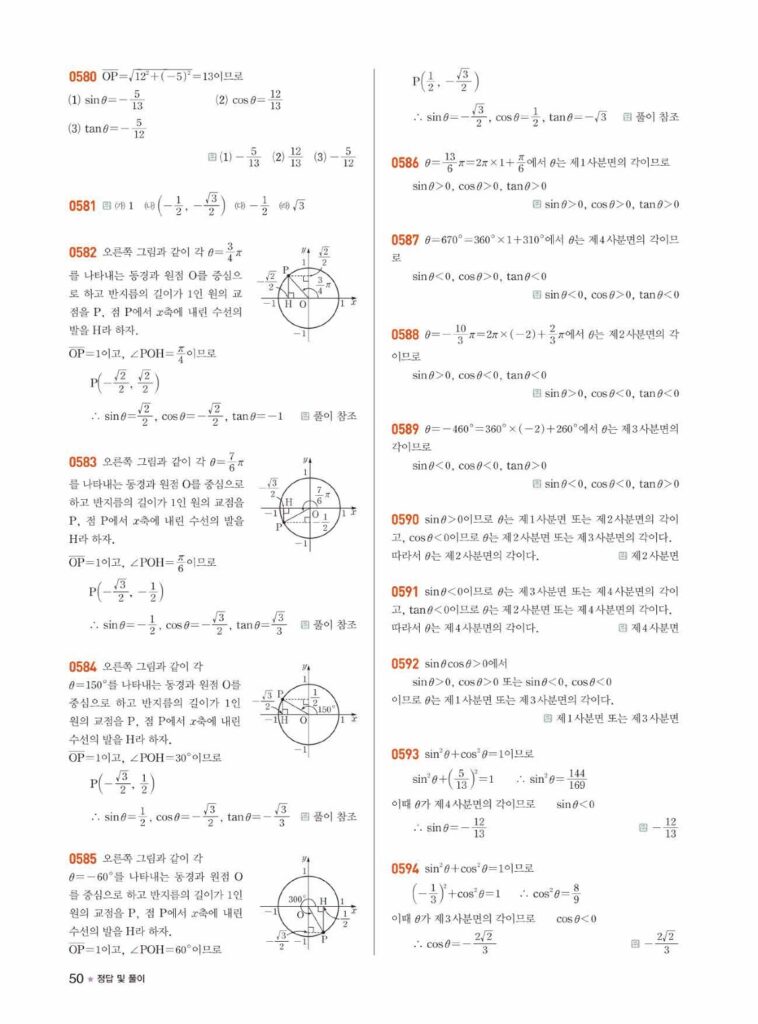 이 단원에서는 각도를 실수로 나타내는 호도법(Radian)을 배웁니다. 또한 좌표평면 위에서 동경의 위치에 따라 $\sin, \cos, \tan$의 부호가 어떻게 결정되는지(얼싸안코)를 확실히 익혀야 합니다.