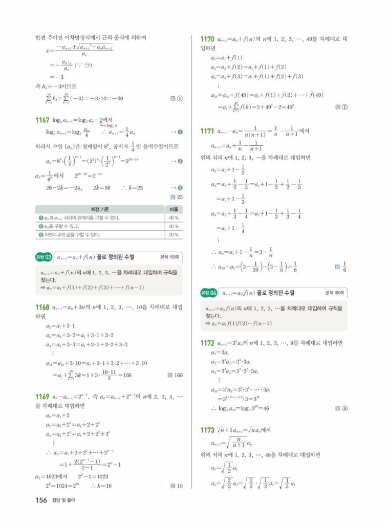 이웃하는 항 사이의 관계식인 점화식을 보고 어떤 수열인지 파악하는 것이 중요합니다. 또한, 수학적 귀납법 증명은 ‘$n=k$일 때 성립한다고 가정하면 $n=k+1$일 때도 성립한다’는 논리 구조를 빈칸 채우기 문제로 연습해야 합니다.