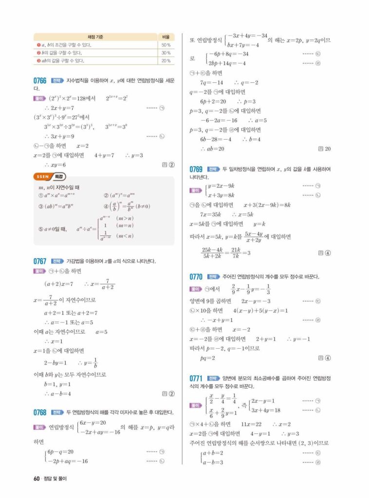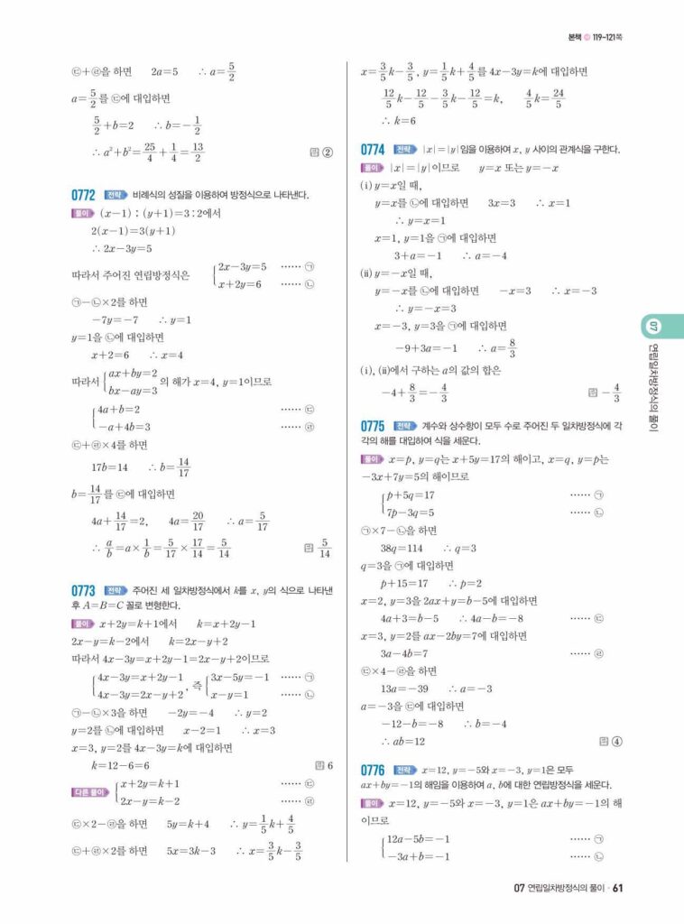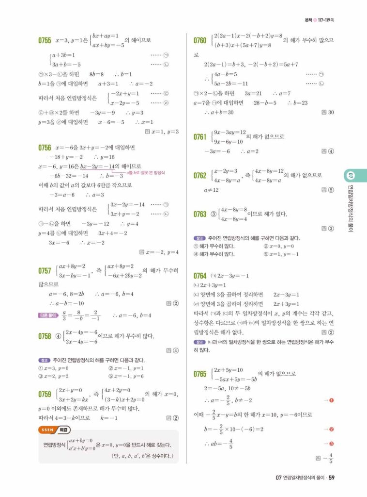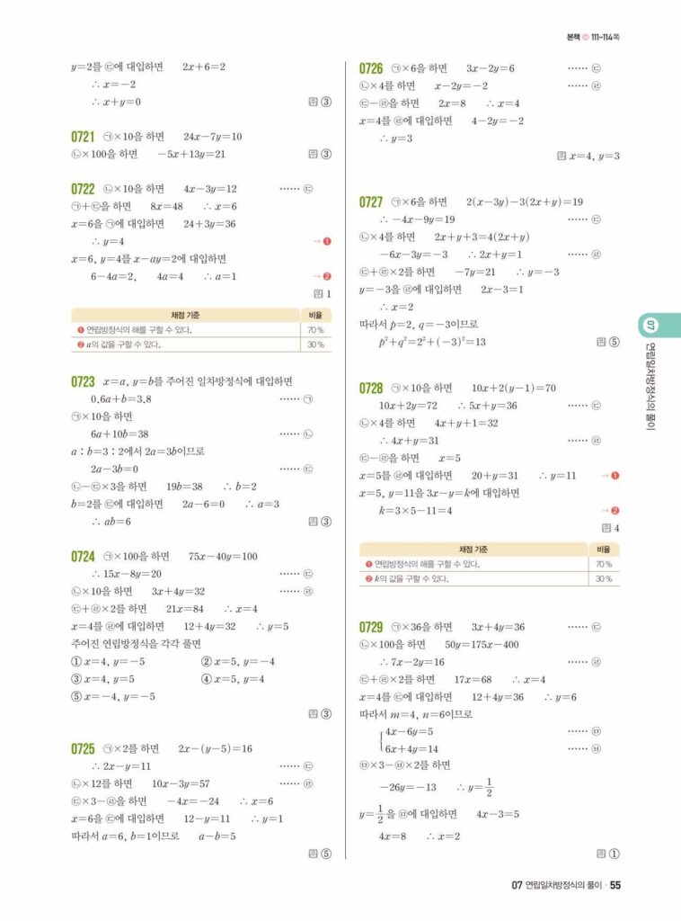 안녕하세요. 쎈 중2-1 07단원 연립일차방정식의 풀이 정답 및 해설입니다.