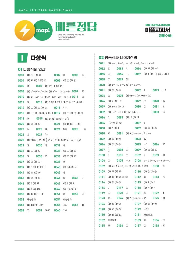 마플시너지 공통수학1 답지 PDF 다운로드 (2025년, 행렬 포함)