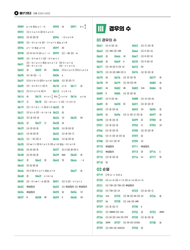 이 책은 방대한 문항 수와 유형별 정리로 유명합니다. 2022 개정 교육과정이 반영되어 행렬 단원이 추가되었으며, 복잡한 계산 문제가 많아 해설지의 역할이 중요합니다. 아래에서 빠른 정답과 단원별 상세 풀이를 확인하세요.