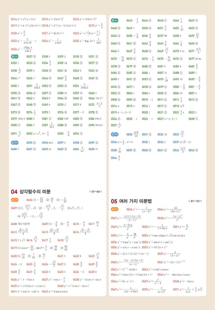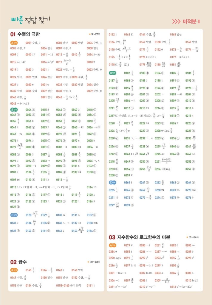 이 과목은 수열의 극한부터 시작하여 지수, 로그, 삼각함수 등 초월함수의 미적분을 다룹니다. 계산 과정이 매우 길고 복잡하므로, 아래에서 빠른 정답과 단원별 상세 해설을 확인하여 효율적으로 학습하세요.