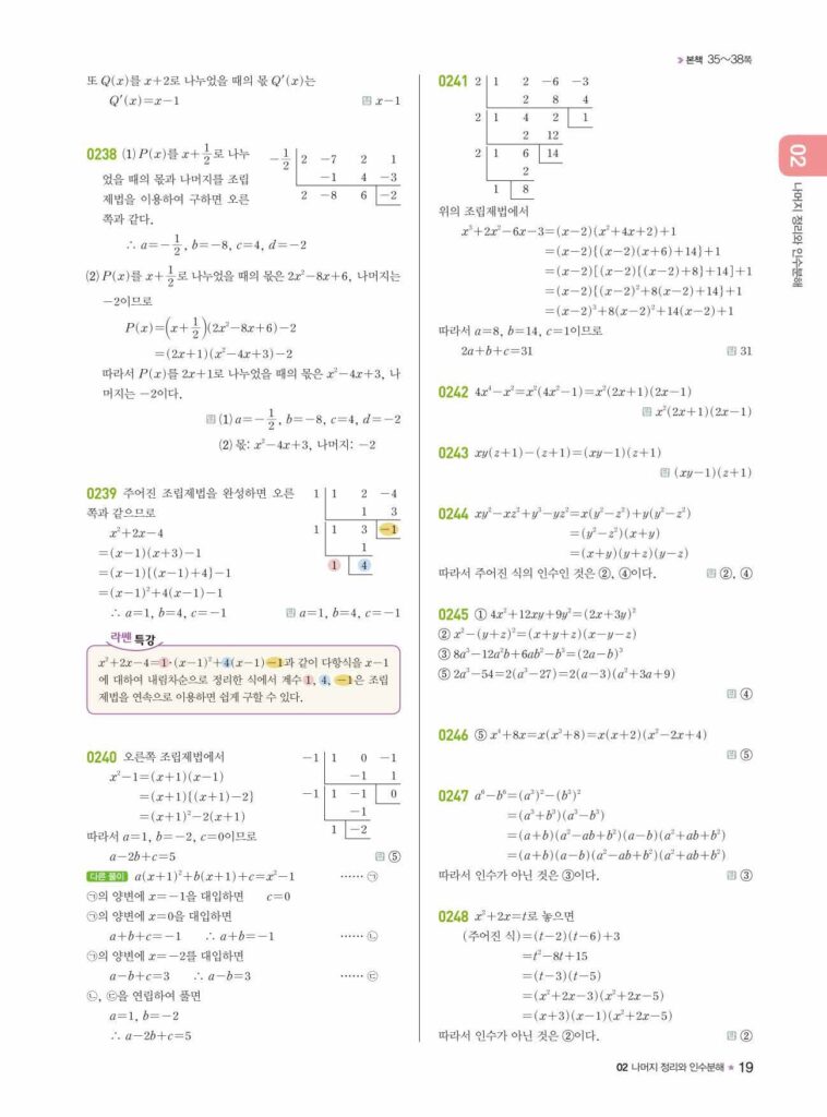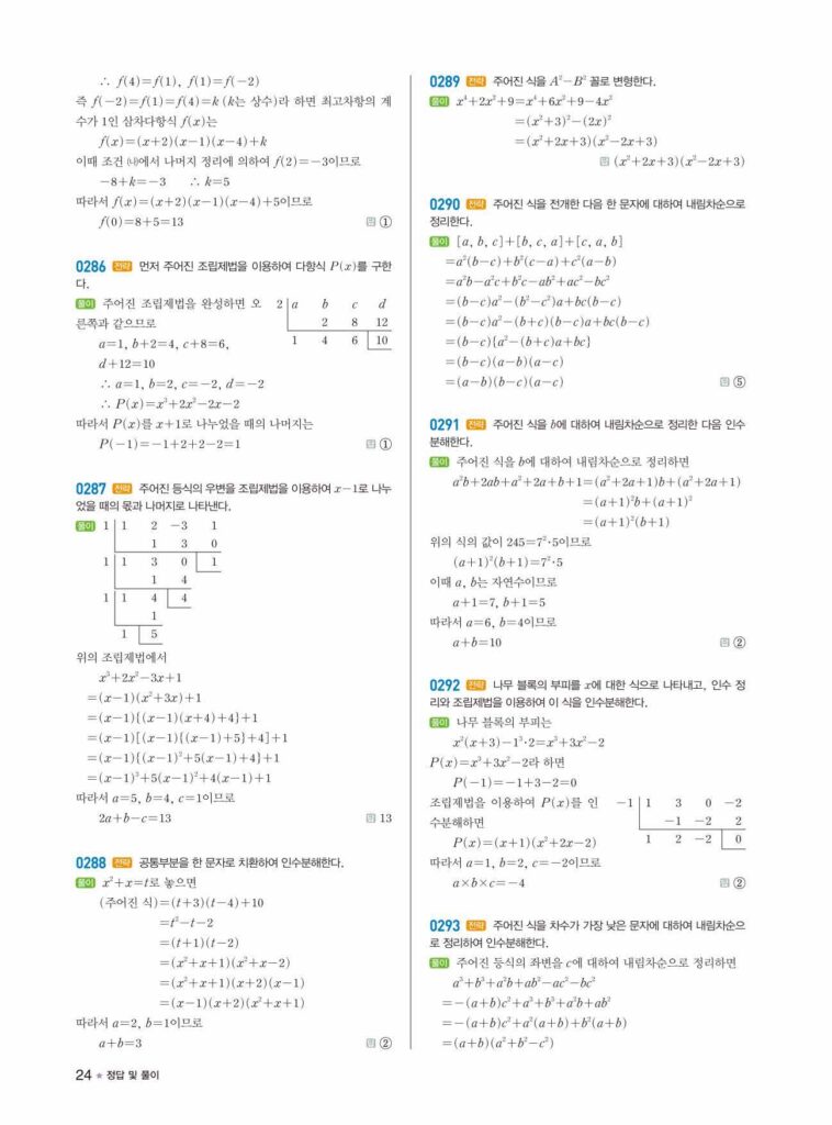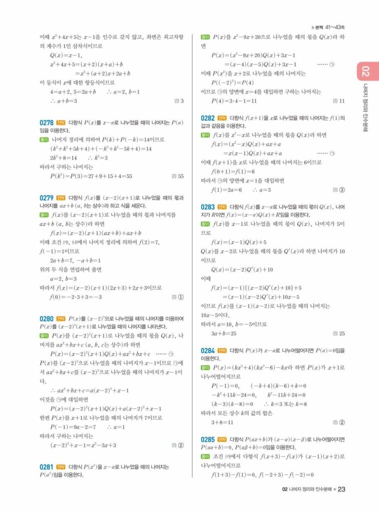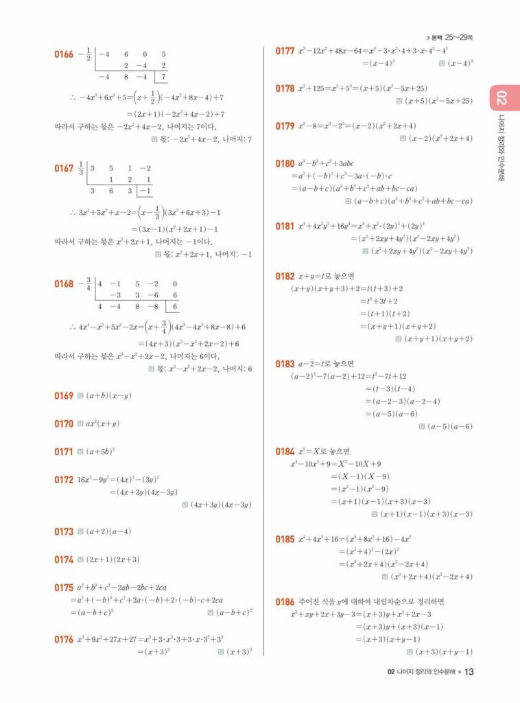 안녕하세요. **라이트쎈 공통수학1** **02단원 나머지정리와 인수분해** 정답 및 해설입니다.