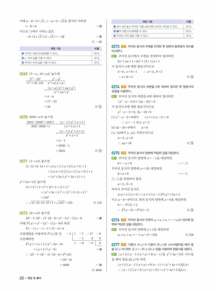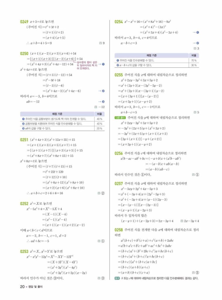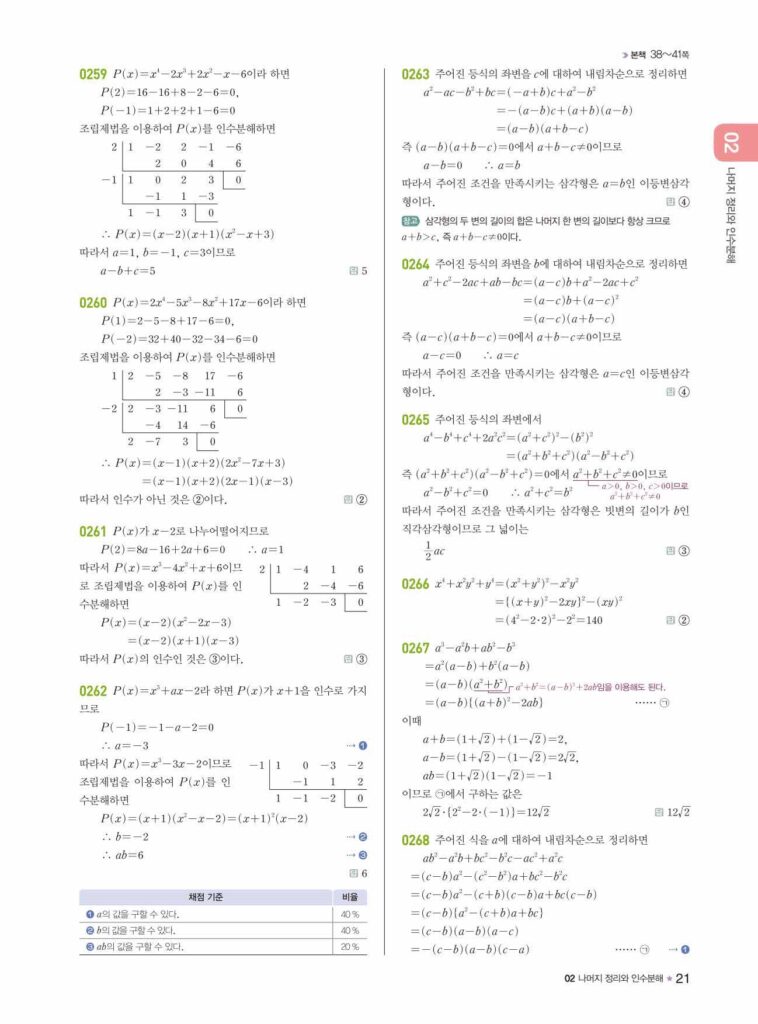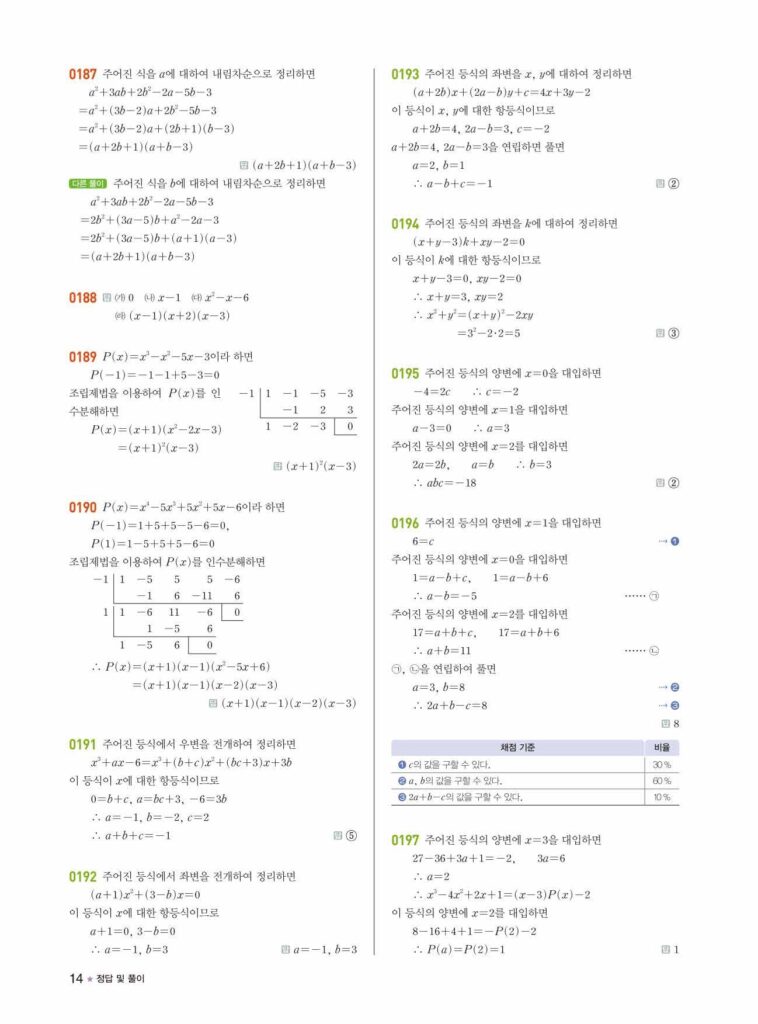 안녕하세요. **라이트쎈 공통수학1** **02단원 나머지정리와 인수분해** 정답 및 해설입니다.