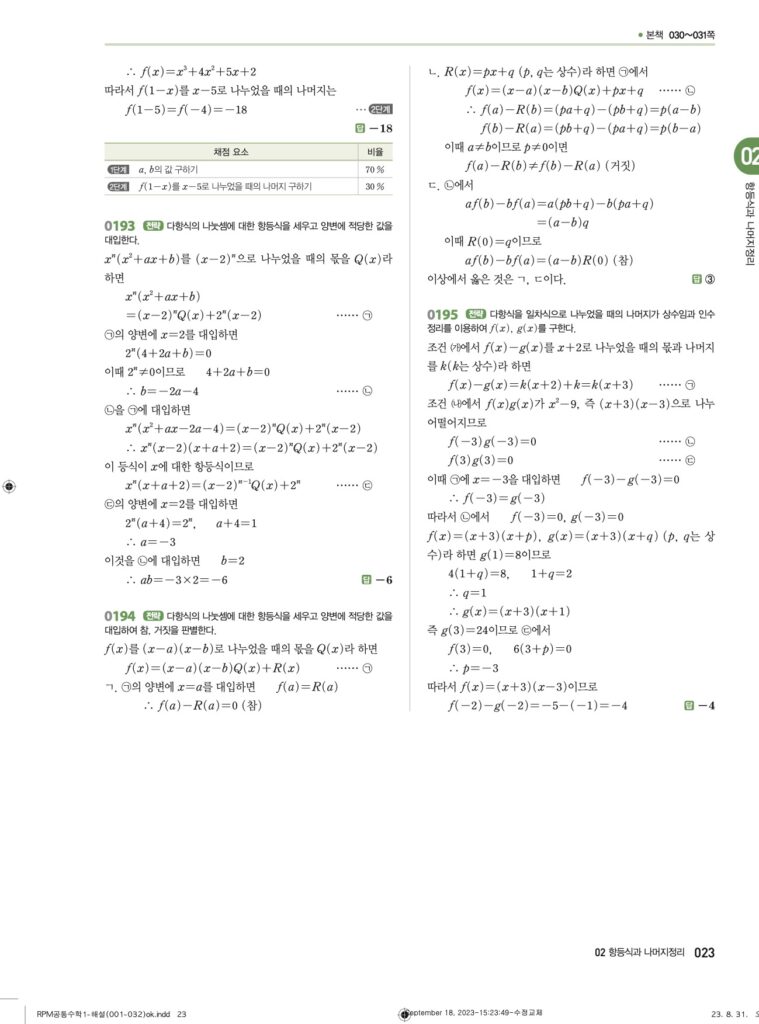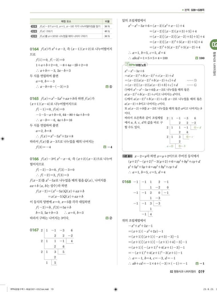 안녕하세요. **RPM 공통수학1** **02단원 항등식과 나머지정리** 정답 및 해설입니다.