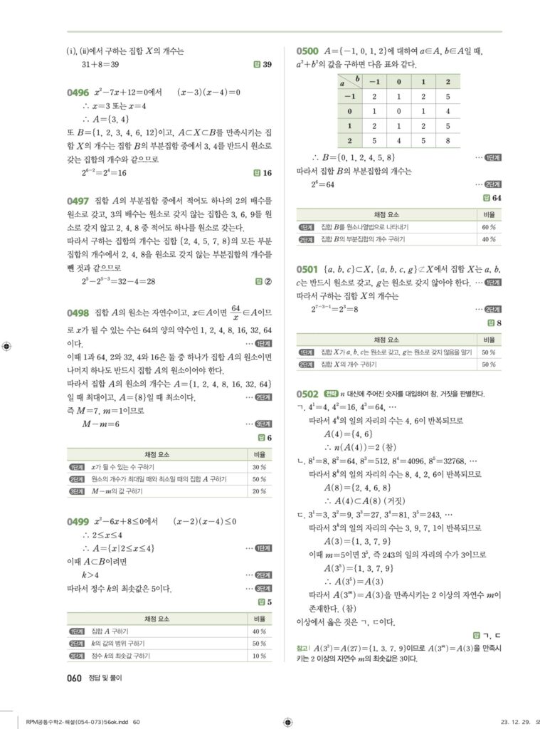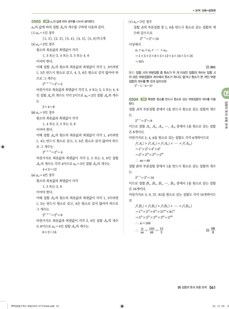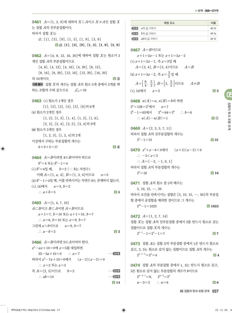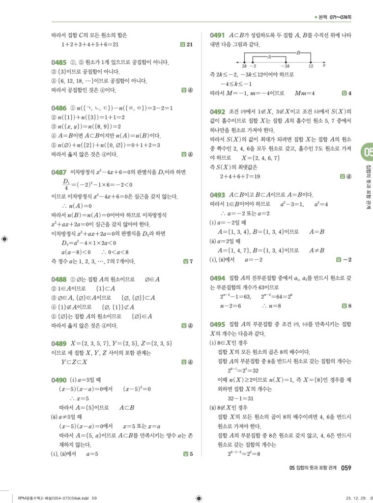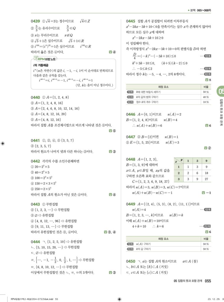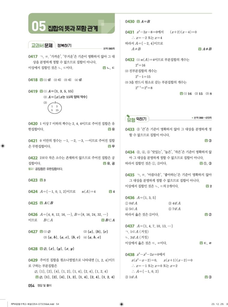 안녕하세요. **RPM 공통수학2** **05단원 집합의 뜻과 포함 관계** 정답 및 해설입니다.
