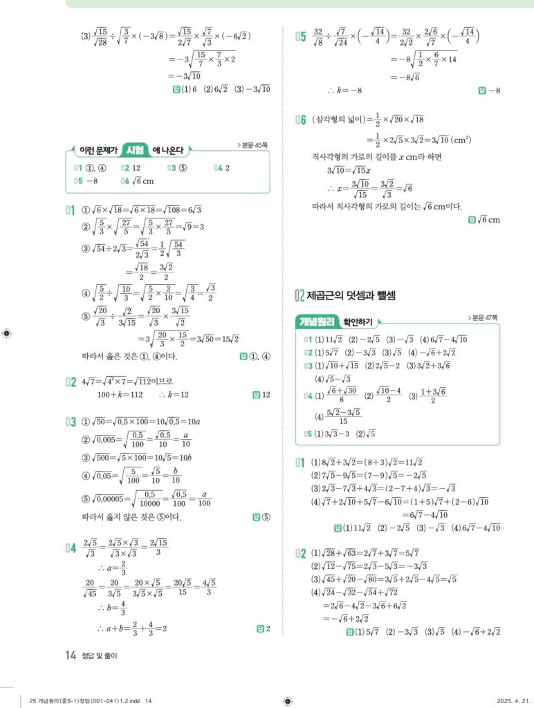 안녕하세요. **개념원리 중3-1** **02단원 근호를 포함한 식의 계산** 정답 및 해설입니다.