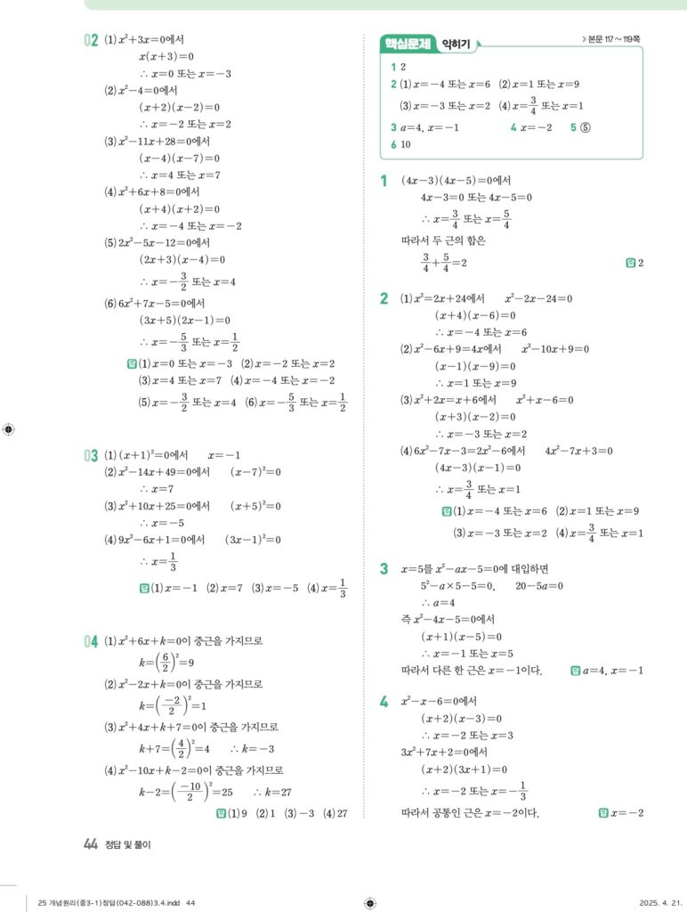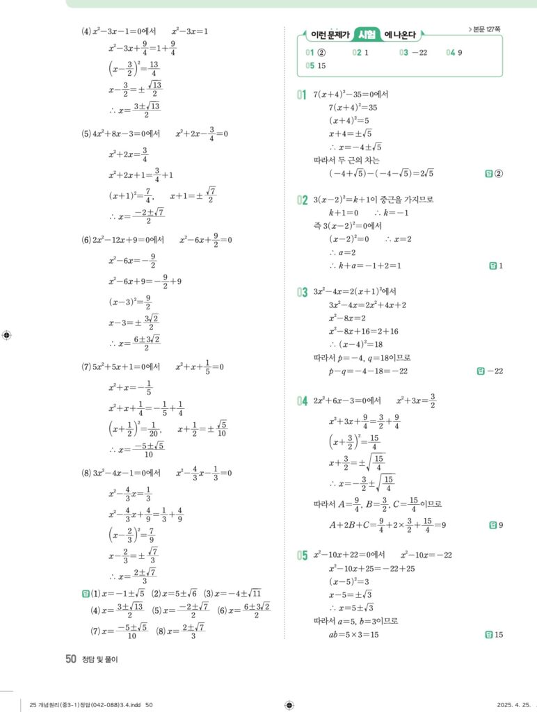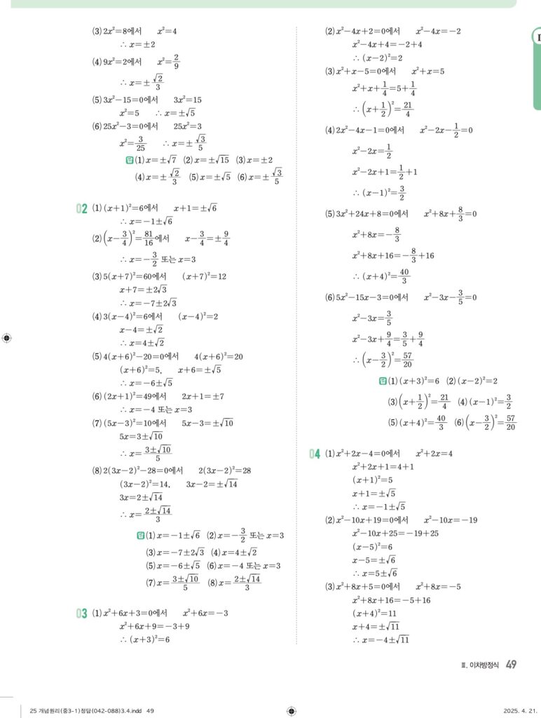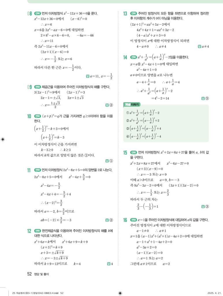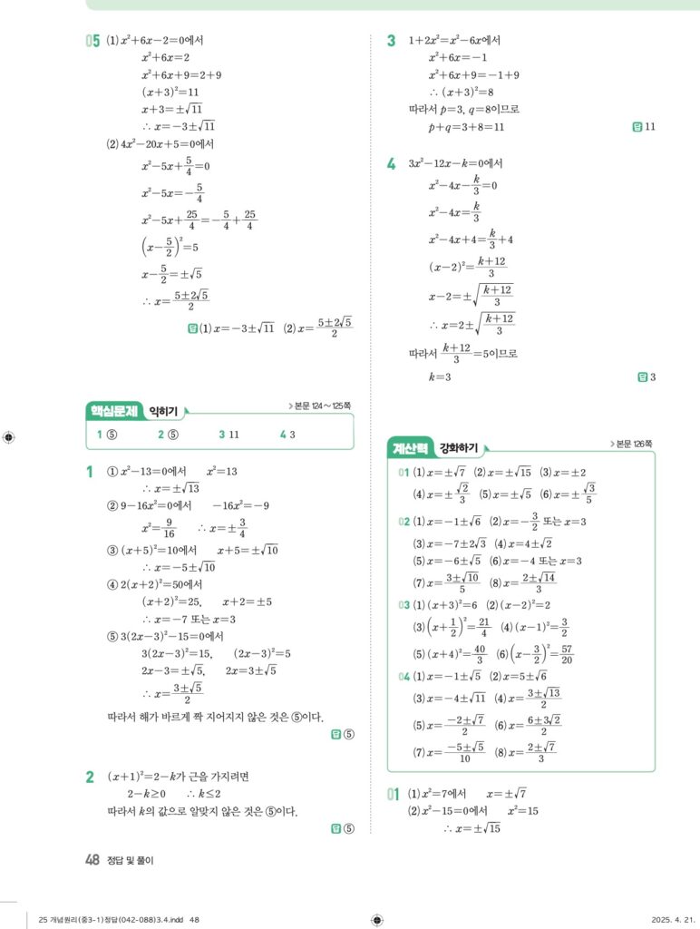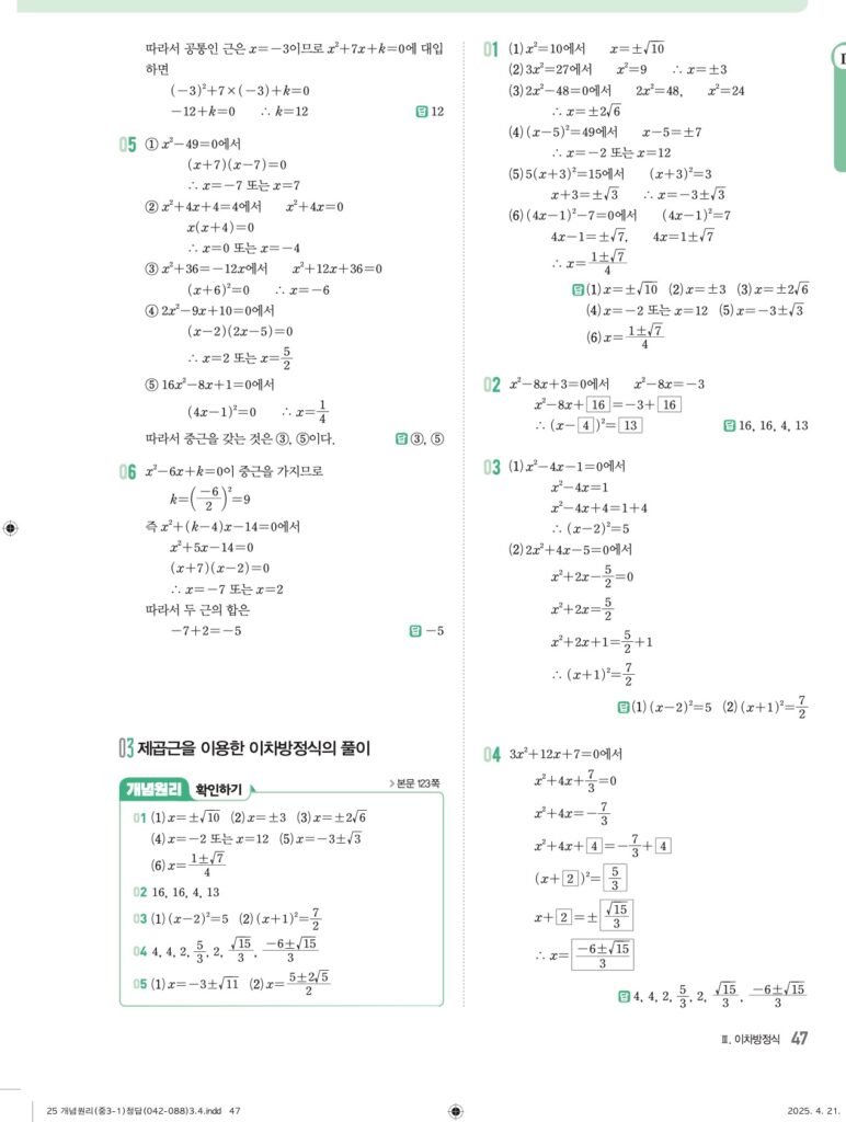 개념원리 중3-1 05. 이차방정식의 풀이 답지