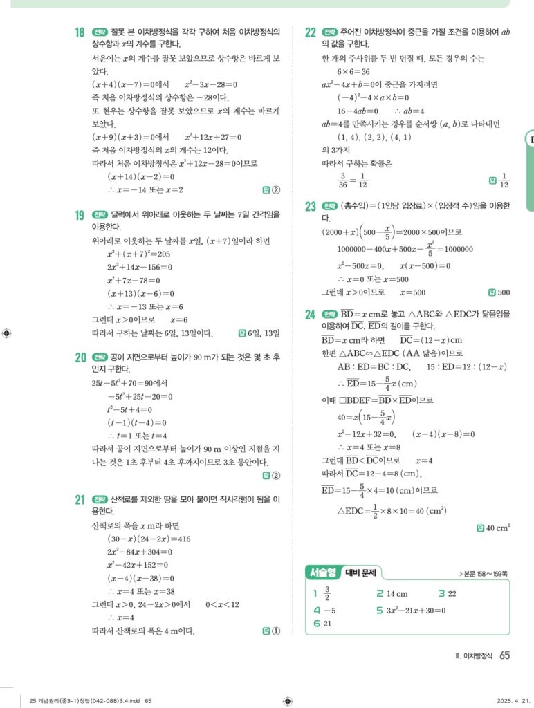 근의 공식으로 구한 근 중, $\mathbf{x>0}$ (길이, 시간) 또는 $\mathbf{x}$가 정수(사람 수)라는 문제의 조건을 만족하는 해만 최종 답이 될 수 있습니다. 답지에서는 이 **확인 과정**을 놓치지 않았는지 점검하세요.