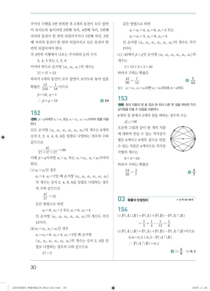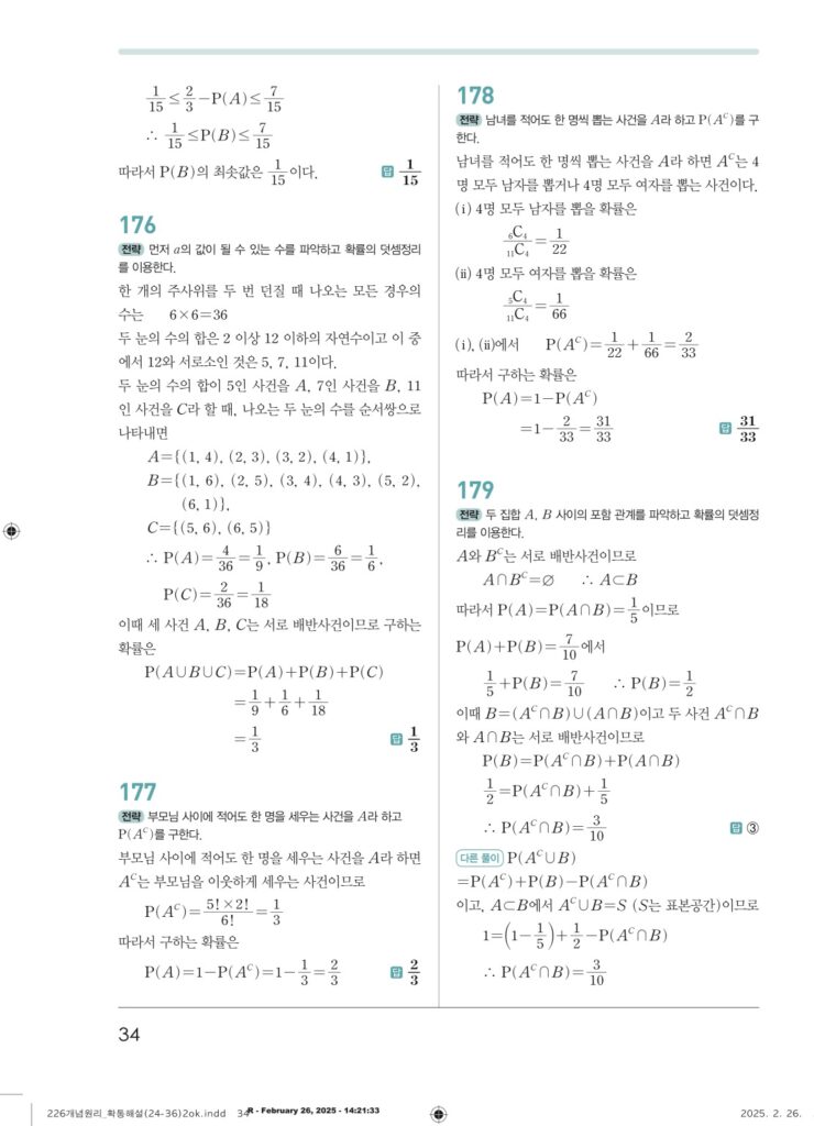 **확률($P(A)$)**은 전체 경우의 수($n(S)$)를 정확히 구하는 것이 핵심입니다. **여사건의 확률($1-P(A^c)$)**을 이용하면 ‘적어도’ 조건이 붙은 복잡한 문제도 쉽게 해결할 수 있습니다.