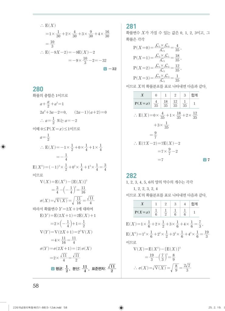 **확률변수($X$)**를 도입하여 확률을 표로 나타내는 단원입니다. **확률의 총합은 1**이라는 기본 성질과, 평균($E[X]$)과 분산($V[X]$)을 구하는 공식을 정확히 암기하고 적용하는 것이 중요합니다.